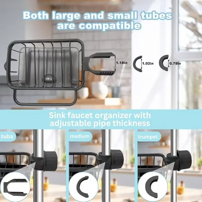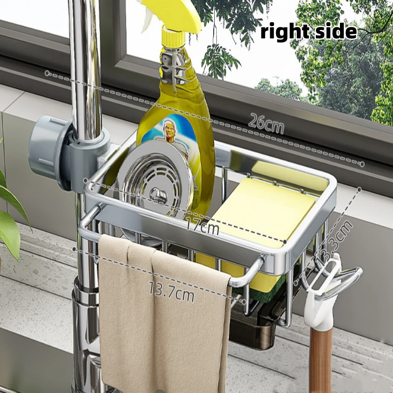 Cette étagère est très adaptée au stockage de divers articles, tels que les tissus, les éponges, les brosses, etc. Il a plusieurs compartiments et des crochets pour aider à garder la zone d’évier propre et commandée, garantissant un accès facile aux outils de nettoyage.