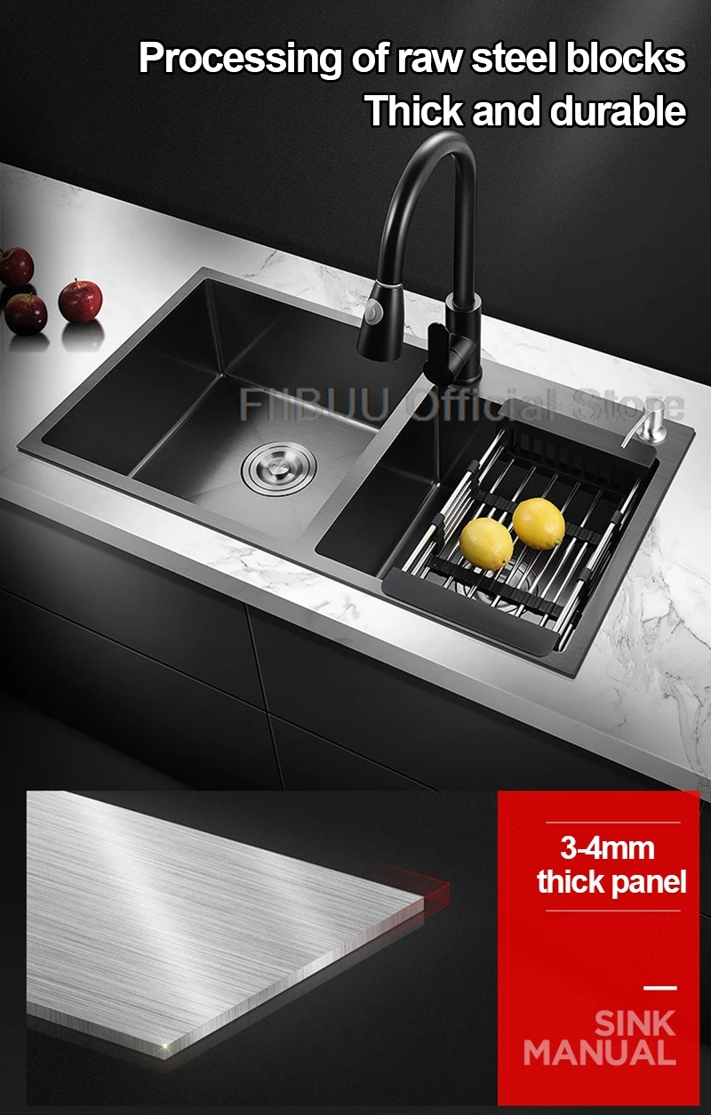2. Matériau de haute qualité: Nous sommes fabriqués en acier inoxydable 304 de haute qualité avec une excellente dureté et durabilité. L’évier de cuisine est traité avec un nano-revêtement pour plus de durabilité. Essuyer pour un entretien facile. Nos éviers ont été épaissis et les panneaux en acier inoxydable sont plus épais et plus solides que les panneaux utilisés dans la plupart des éviers sur le marché.