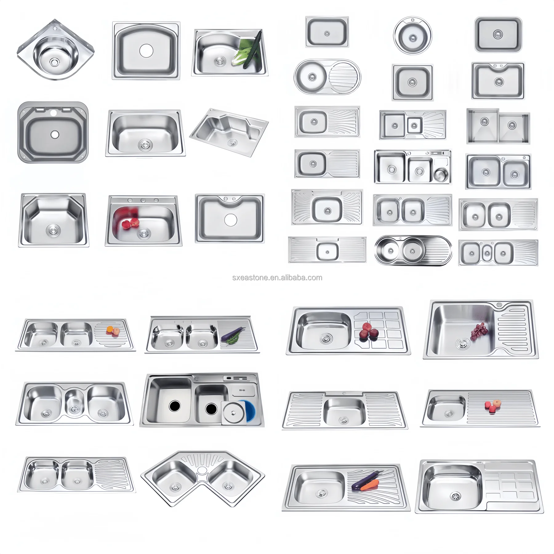 - Accessories: Strainers Cutting board Soap dispenser Faucet Drain-pipe