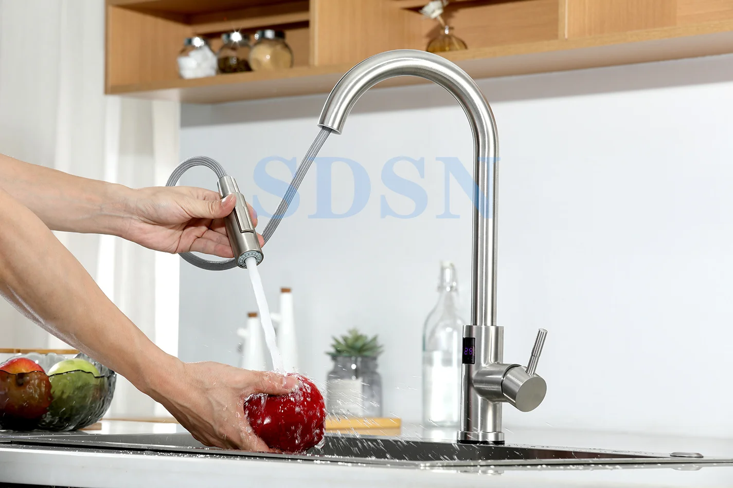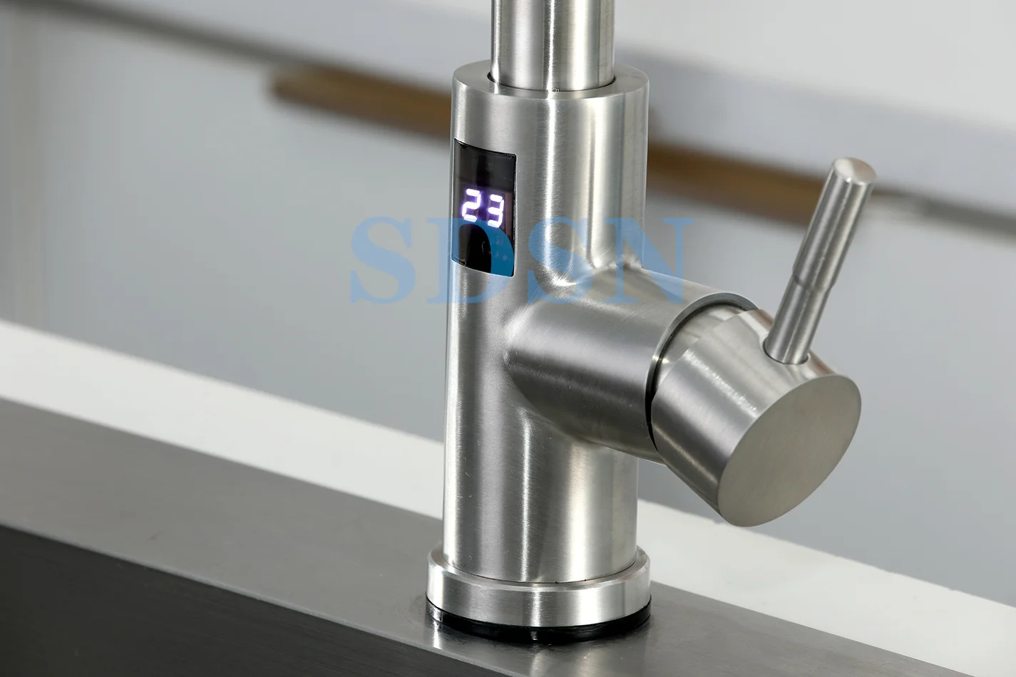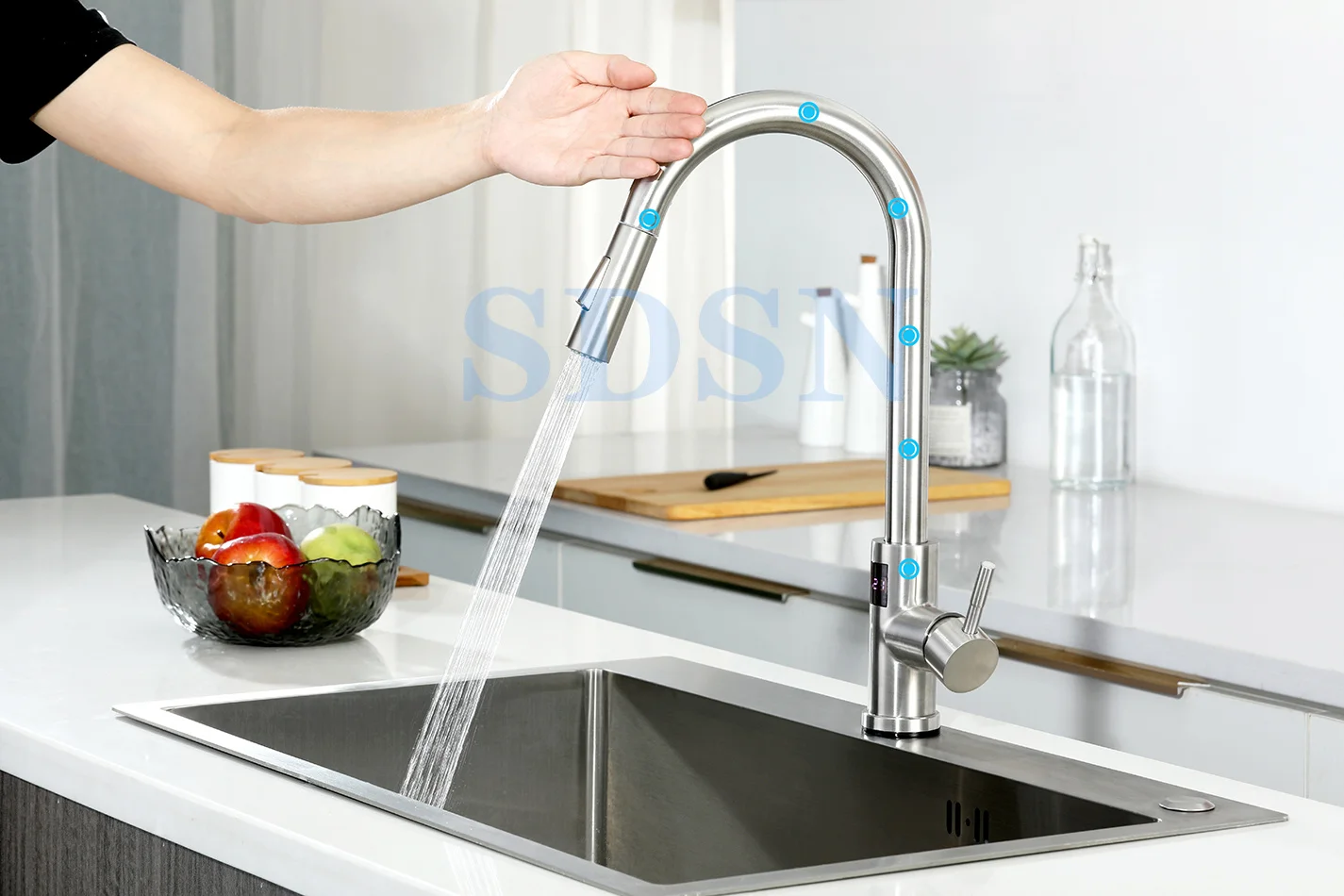 [Robinet de cuisine tactile]: la fonction Touch on peut être effectuée en utilisant votre poignet, votre avant-bras ou toute autre partie du corps pour démarrer et arrêter sur le bec du robinet. Une seule poignée est utilisée pour contrôler le débit d’eau et l’eau chaude/froide manuellement. Il s’arrête automatiquement après 2 minutes pour éviter d’oublier de l’éteindre.