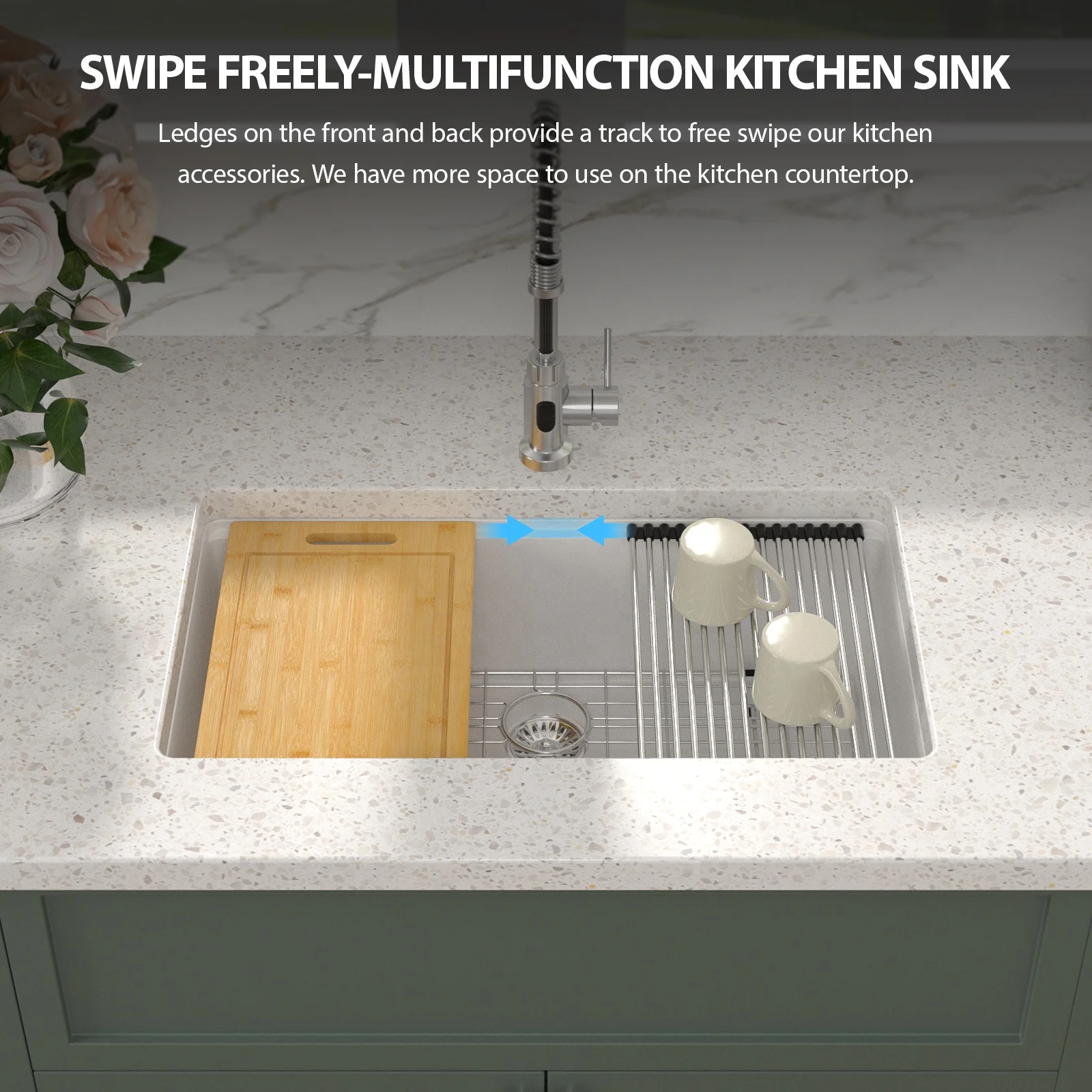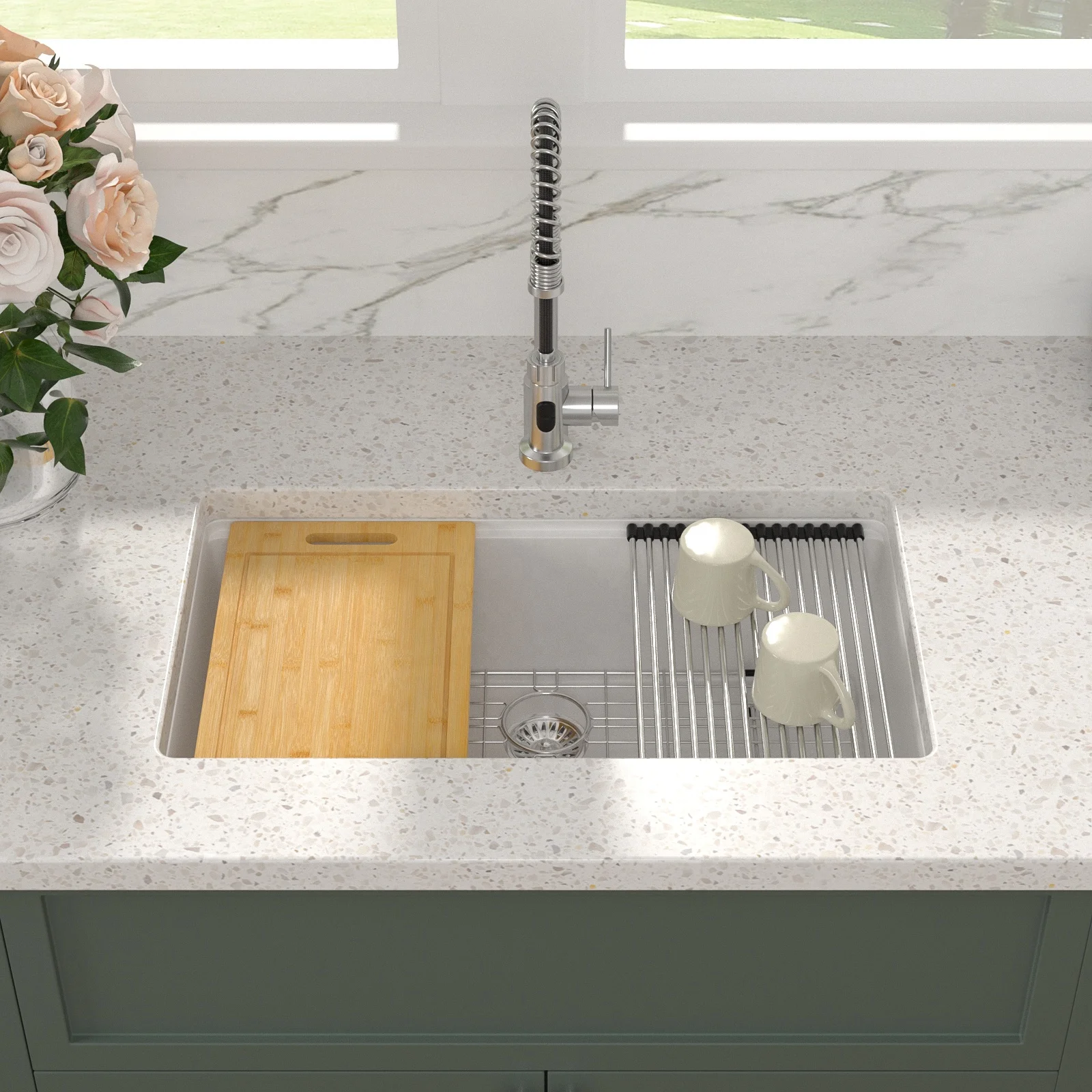 - Accessories: Drain Assembly, Roll-Up Rack,Stainless Steel Bottom Grid,Cutting Board
