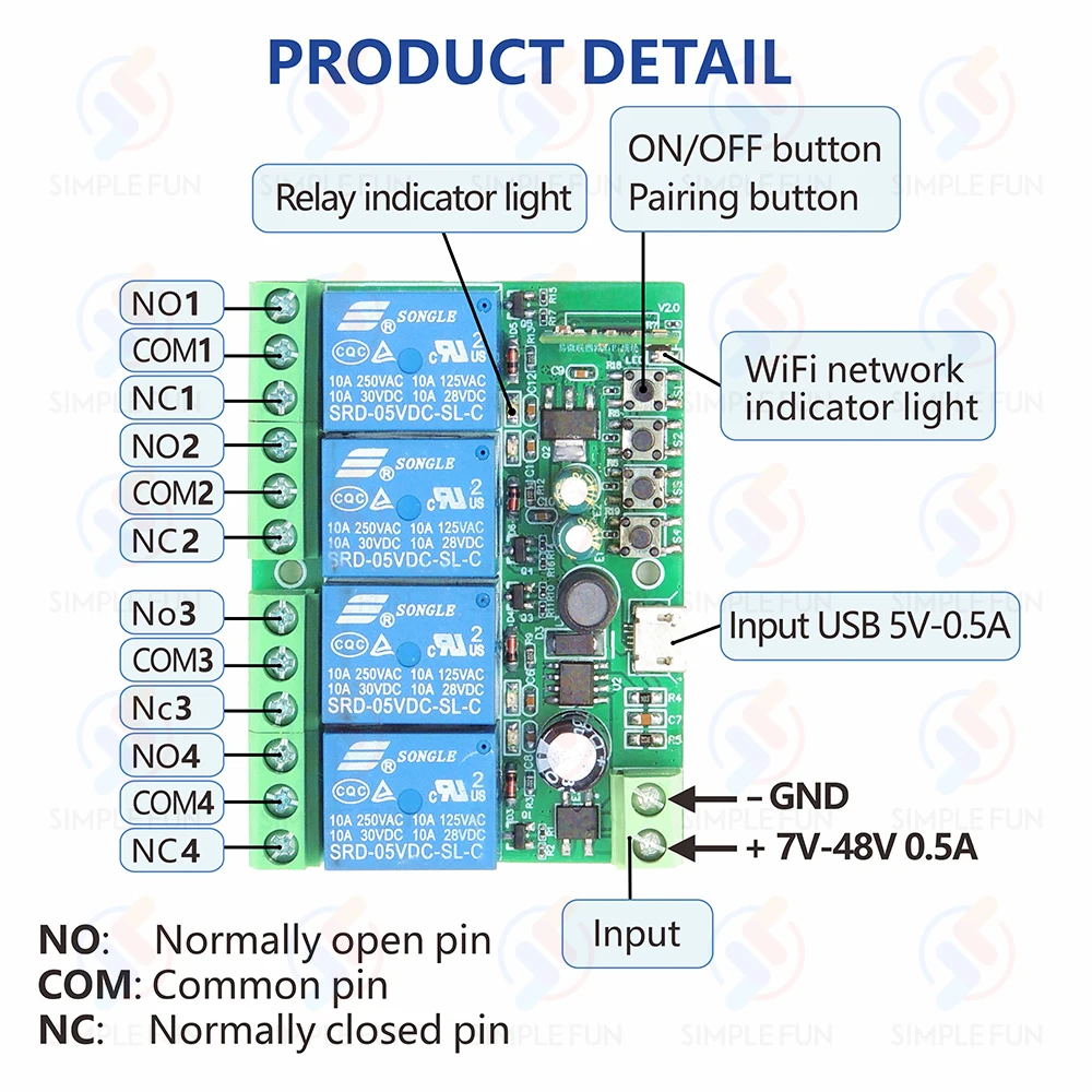 - Working voltage: DC 7-48V or USB 5V