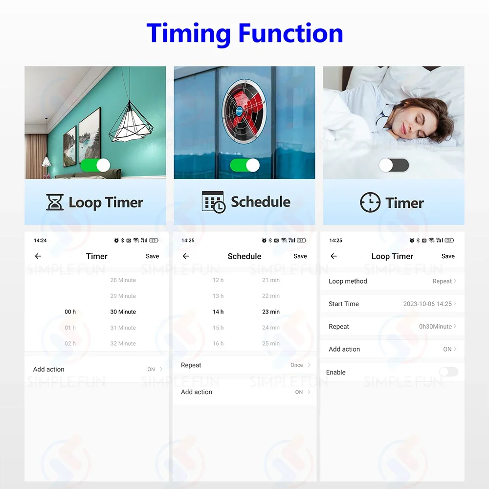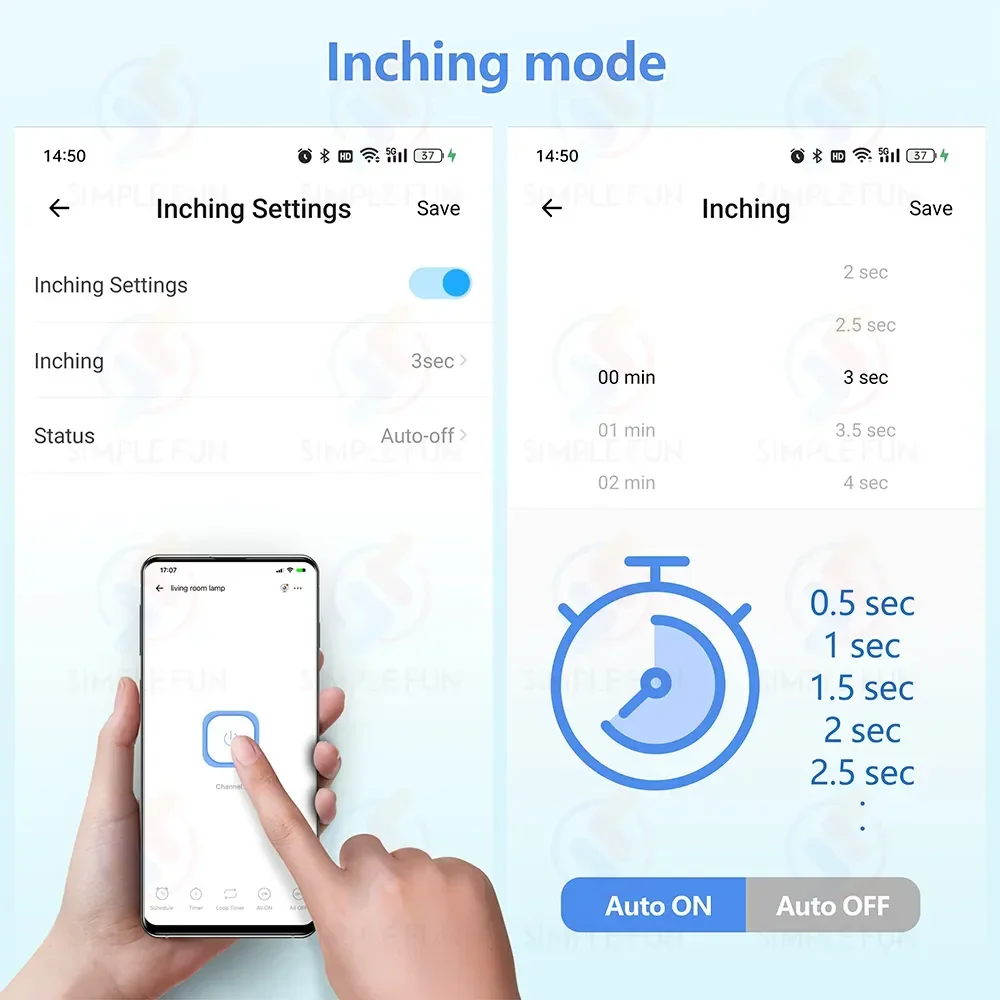 Vous pouvez définir ce mode sur votre téléphone. Dans ce mode, vous pouvez configurer l’interrupteur intelligent ON OFF automatiquement après XXX secondes (vous pouvez configurer la synchronisation exacte)
