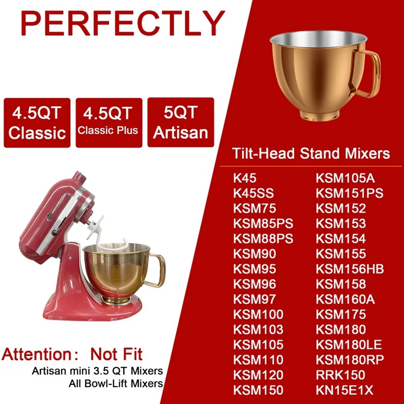 Notre bol mélangeur est compatible avec le mélangeur à tête inclinable Artisan&Classic Series 4.5-5 QT, adapté pour KSM150, RRK150, K45SS, KSM75, KSM90, KSM95, KSM100, KSM103, KSM110, 5KSM125, 5KSM150, 5KSM175, etc.(Veuillez confirmer votre modèle de mixeur avant de passer une commande)