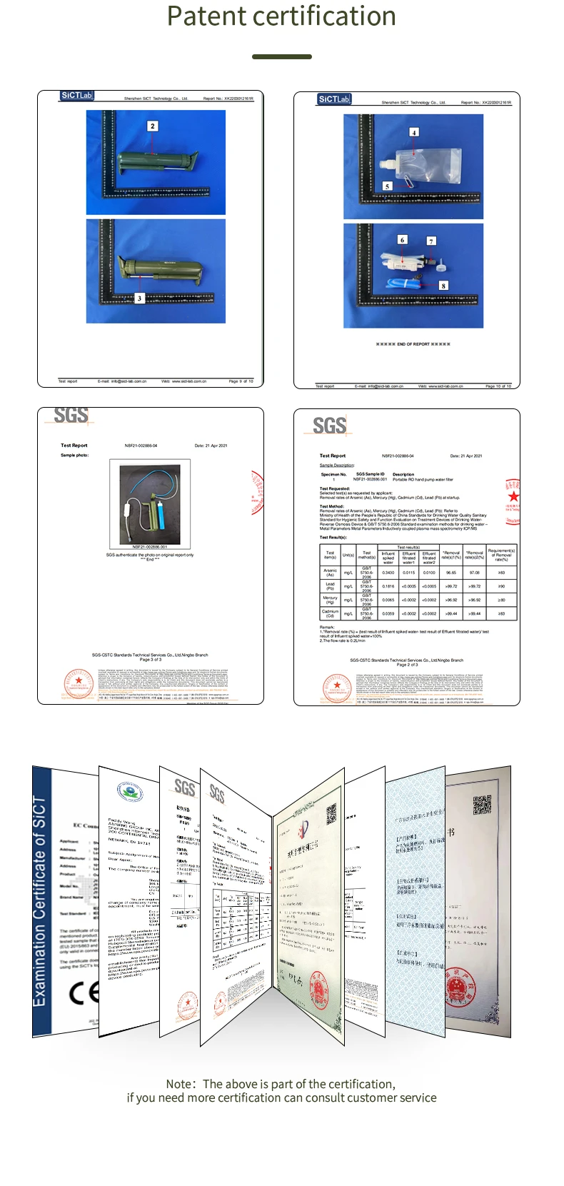 Convient pour l’eau de source de montagne, les rivières, les lacs, les ruisseaux, l’eau souterraine, l’eau de neige, l’eau de surface, l’eau du robinet et autres sources d’eau douce sans pollution chimique.(L’eau de mer ne peut être filtrée, l’osmose inverse peut éliminer les métaux et les sels lourds)