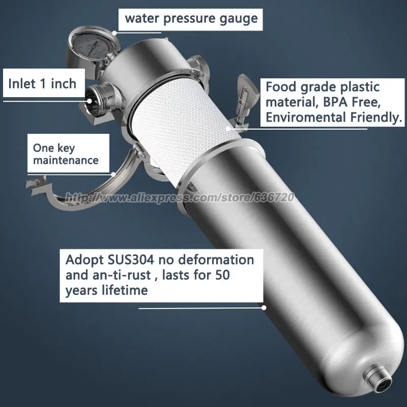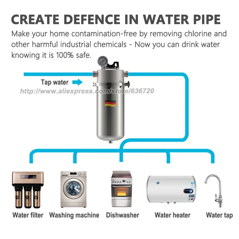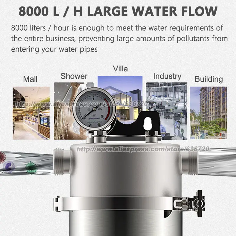 1. Pré-filtre à eau, la porte de protection du canal d’eau total pour toute la maison, empêche les céréales se mettre dans les tuyaux d’eau de la maison, tels que les sédiments et la rouille, etc. Protege l’appareil ménager à une durée de vie plus longue.
