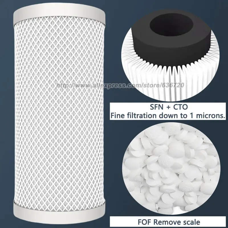 CTO CARBON FILTER REDUCES CHLORINE – Le deuxième étape du filtre à eau par osmose inverse est un filtre Carbon Block.Le filtre à charbon actif de 5 microns réduit le chlore et conditions de l’eau.