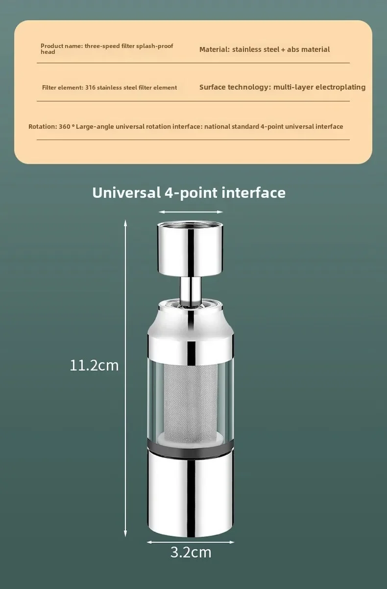 * Augmentation de la pression en trois étapes : conçu avec trois réglages de pression réglables, ce filtre améliore le débit d’eau tout en évitant les éclaboussures, offrant une expérience pratique et sans dégâts pendant l’utilisation.
