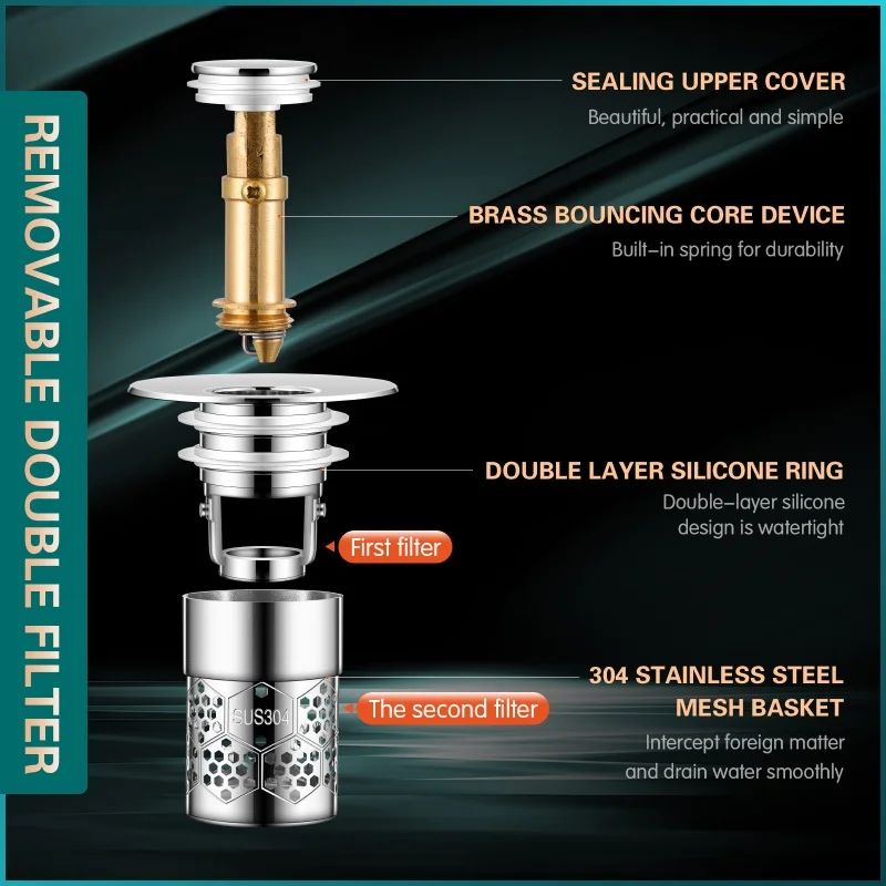 • Stainless Steel Odor Proof Bouncing Core,: Press Type Sink Drain