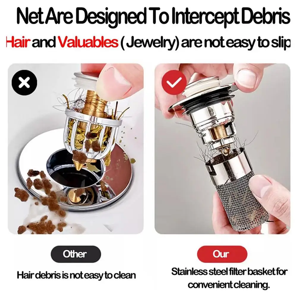 1.Easy to Operate: Designed to prevent clogging of bathroom sinks, this hair catcher has a pop-up mechanism and a stainless steel filter basket that moves for effortless maintenance.