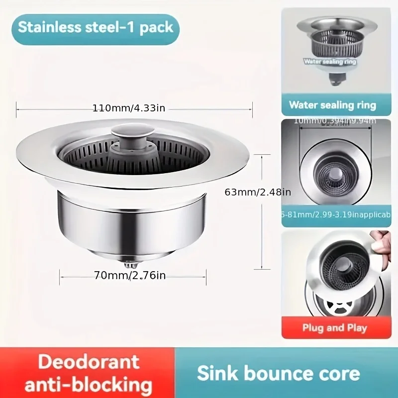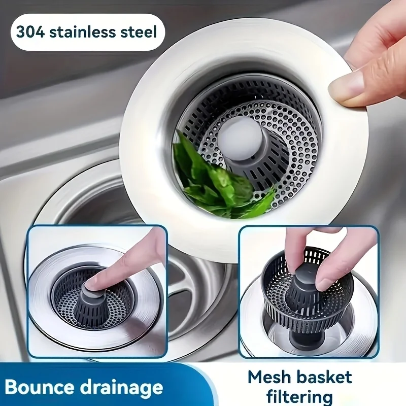 Filtre d’évier de cuisine 3 en 1, Pop-Up ABS plaqué argent, panier de vidange, arrêt du blocage, noyau rebondissant, bouchon anti-fuite