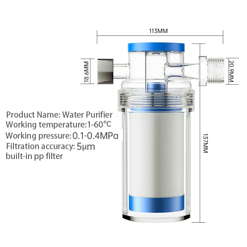 water purifier filter:Stainless steel filter mesh,precision is up to 40 to 60 micrometerUnique swivel sludge scraper design,no need to disassemble,instantaneous cleaningEffectively remove limescale,thermonatrite,plankton,alga,rust,sand grain and other particulate matter from waterCan be install on pre-waterway of home main water pipe,purify your whole household water.Also can be installed on the waterway of washing machine or water purification system to improve their lifespanWorking pressure: 0.1-0.4MpaFiltration accuracy:0.005mmbuilt-in pp filterLength 102 diameter 47 mmColor:white +bluematerial:plastic + PPSize:13.7×111.3cmPackage Contents:1 x water purifier filter(in pp filter)or 5 x water purifier filter
