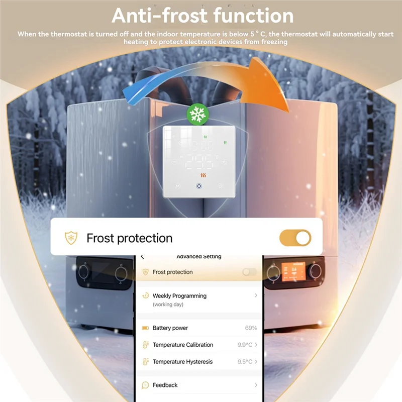 2.Commande vocale : fonctionne avec Alexa et Google Home pour obtenir le contrôle vocal.Une seule commande vocale et le thermostat intelligent peut fonctionner, libérant ainsi vos mains.