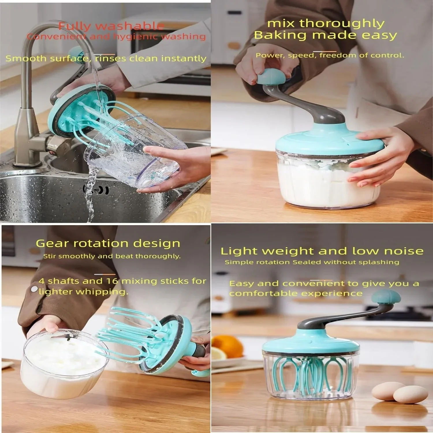Gain de temps: il suffit de le secouer à la main et il finira de mélanger en seulement 50 secondes, aucune attente requise. Le fouet à oeufs est doté d’une tige d’agitation coaxiale à 4 groupes, ce qui permet une transmission plus rapide des protéines, de la crème fouettée, de la mayonnaise, etc., sans aucun bruit.