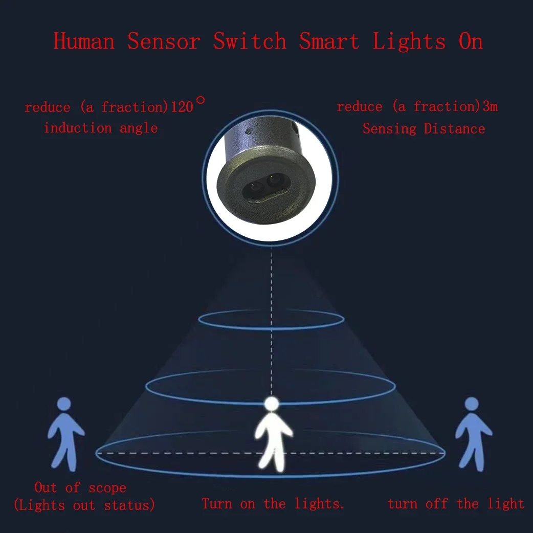 3.Sesor distance 1 ~ 3.5m, quand les gens près, s’allume, laisser après 30s s’éteint