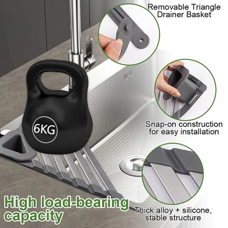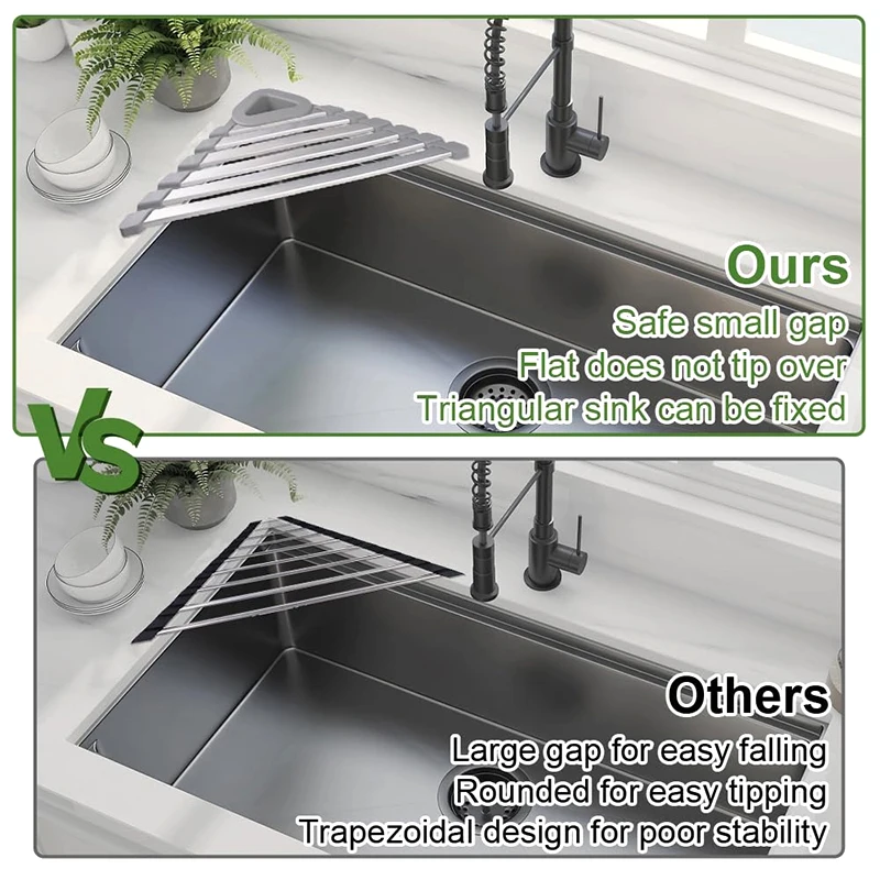 2, structure robuste et stable : construit à partir d’un alliage de haute qualité, ce support d’évier de cuisine offre une forte capacité de charge sans se plier.Sa conception triangulaire assure un ajustement parfait dans l’évier pour une stabilité accrue, tandis que le matériau plat et épais offre un support fiable pour empêcher les ustensiles de basculer.Les joints renforcés enveloppés de silicone améliorent encore l’adhérence et résistent au glissement.