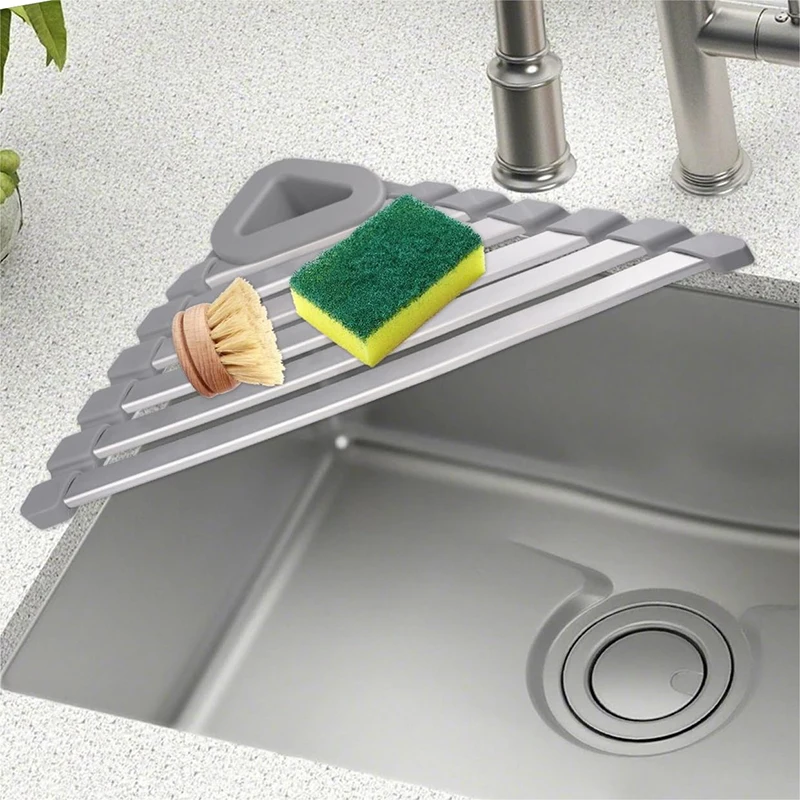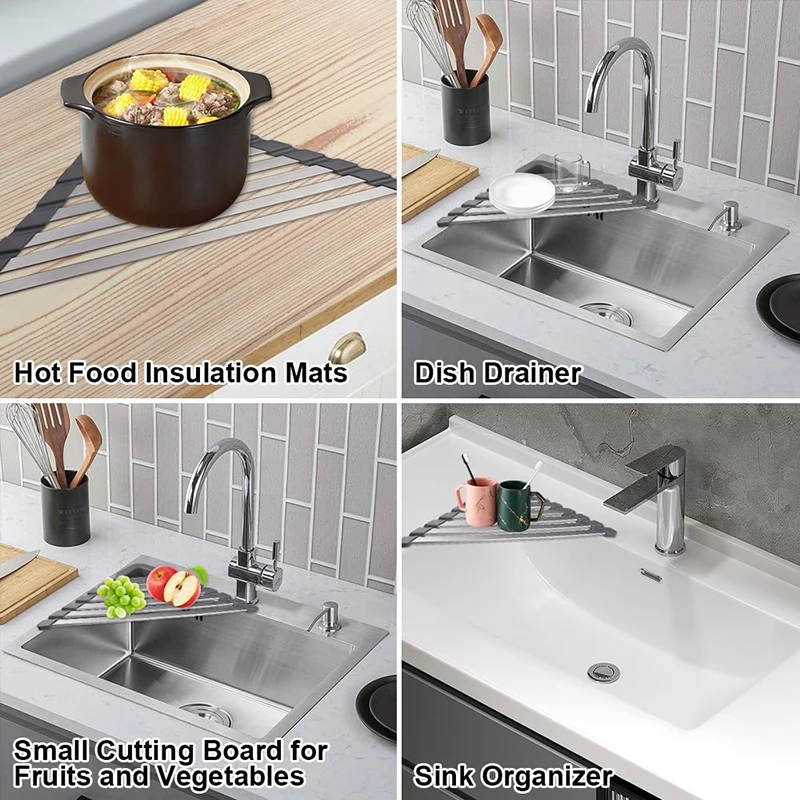 1, conception pliable peu encombrante : ce support à vaisselle enroulable innovant présente une forme triangulaire qui s’adapte parfaitement à la plupart des éviers standard (grâce à son bord en silicone réglable).Il sert à plusieurs fins, notamment le séchage de la vaisselle, des couverts, des fruits et légumes, le stockage des éponges et des savons, et comprend un petit compartiment triangulaire pour filtrer les restes de nourriture ou organiser des cuillères.Lorsqu’il n’est pas utilisé, il se plie de manière compacte pour gagner de la place.