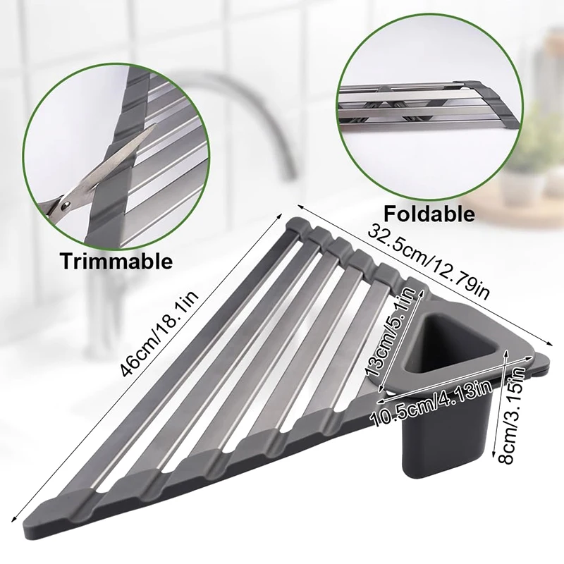 1, conception pliable peu encombrante : ce support à vaisselle enroulable innovant présente une forme triangulaire qui s’adapte parfaitement à la plupart des éviers standard (grâce à son bord en silicone réglable).Il sert à plusieurs fins, notamment le séchage de la vaisselle, des couverts, des fruits et légumes, le stockage des éponges et des savons, et comprend un petit compartiment triangulaire pour filtrer les restes de nourriture ou organiser des cuillères.Lorsqu’il n’est pas utilisé, il se plie de manière compacte pour gagner de la place.