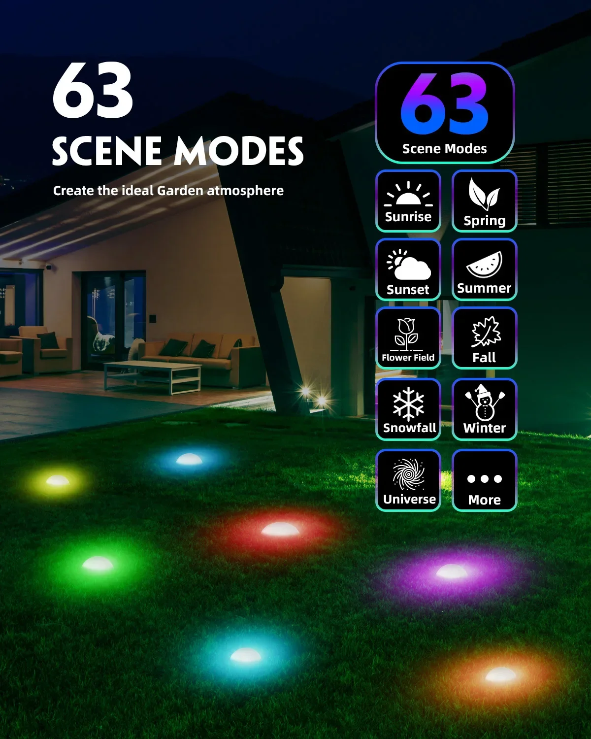☆63 Modes Scène:Tant de modes de scène (lever du soleil, coucher de soleil, champ de fleurs, chute de neige, univers, 4 saisons) pour vous aider à créer l’atmosphère de jardin idéale.