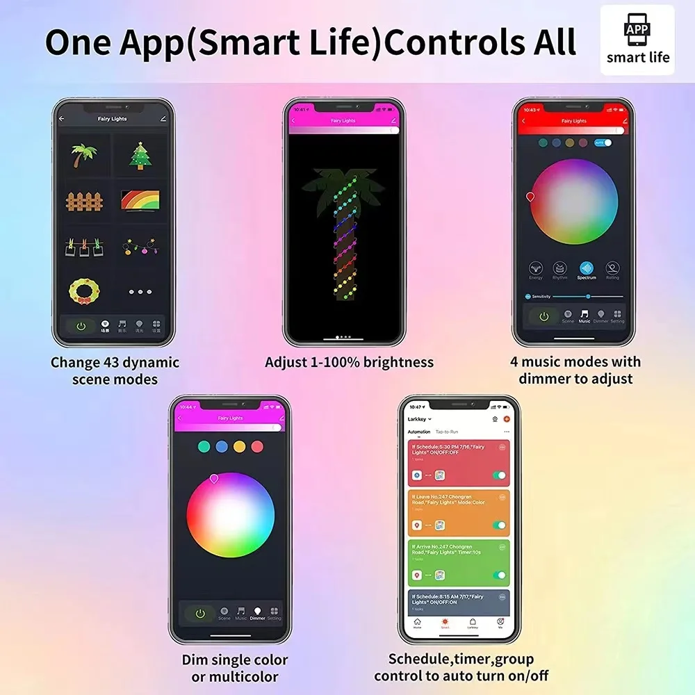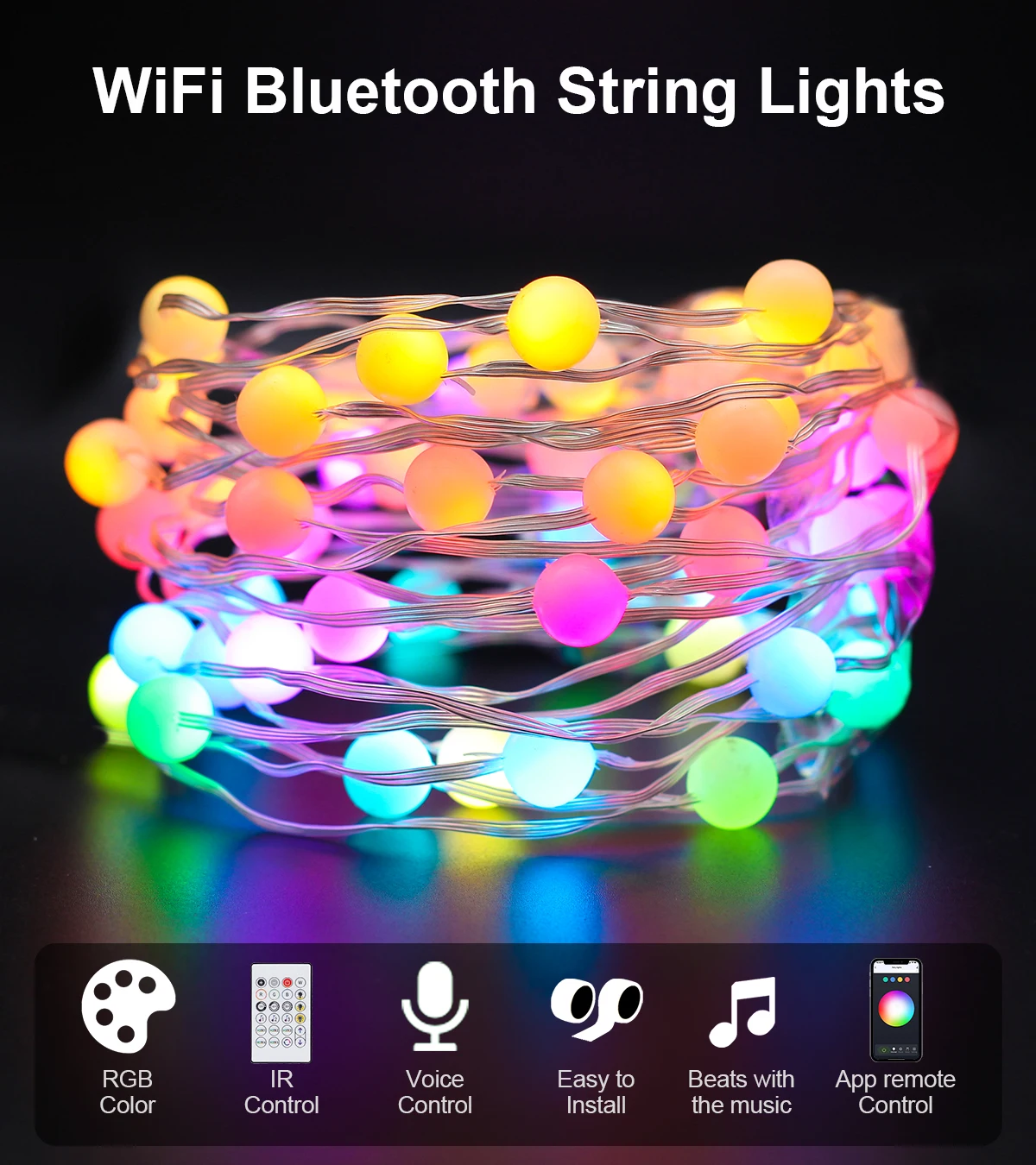 Les guirlandes lumineuses RVB sont étanches pour la décoration de vacances et de Noël, elles peuvent fonctionner avec Amazon Alexa et Google Assistance, vous pouvez contrôler par la voix les guirlandes lumineuses extérieures, changer la couleur, dim la luminosité et régler la minuterie, lumineux votre vie beaucoup de plaisir, le contrôleur intégré avec micro haut-parleur, Il peut donc se synchroniser avec la musique, il ne supporte que le WiFi 2.4Ghz et Bluetooth.