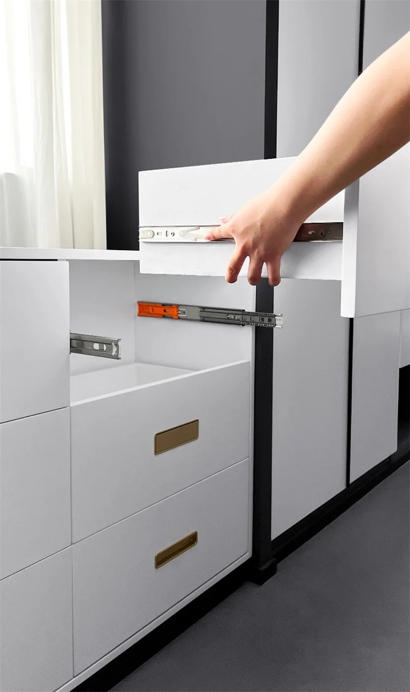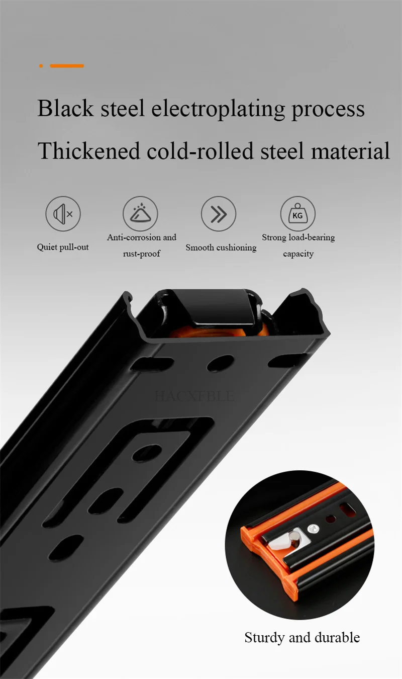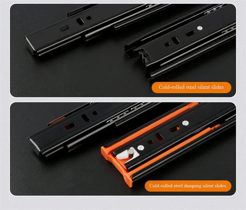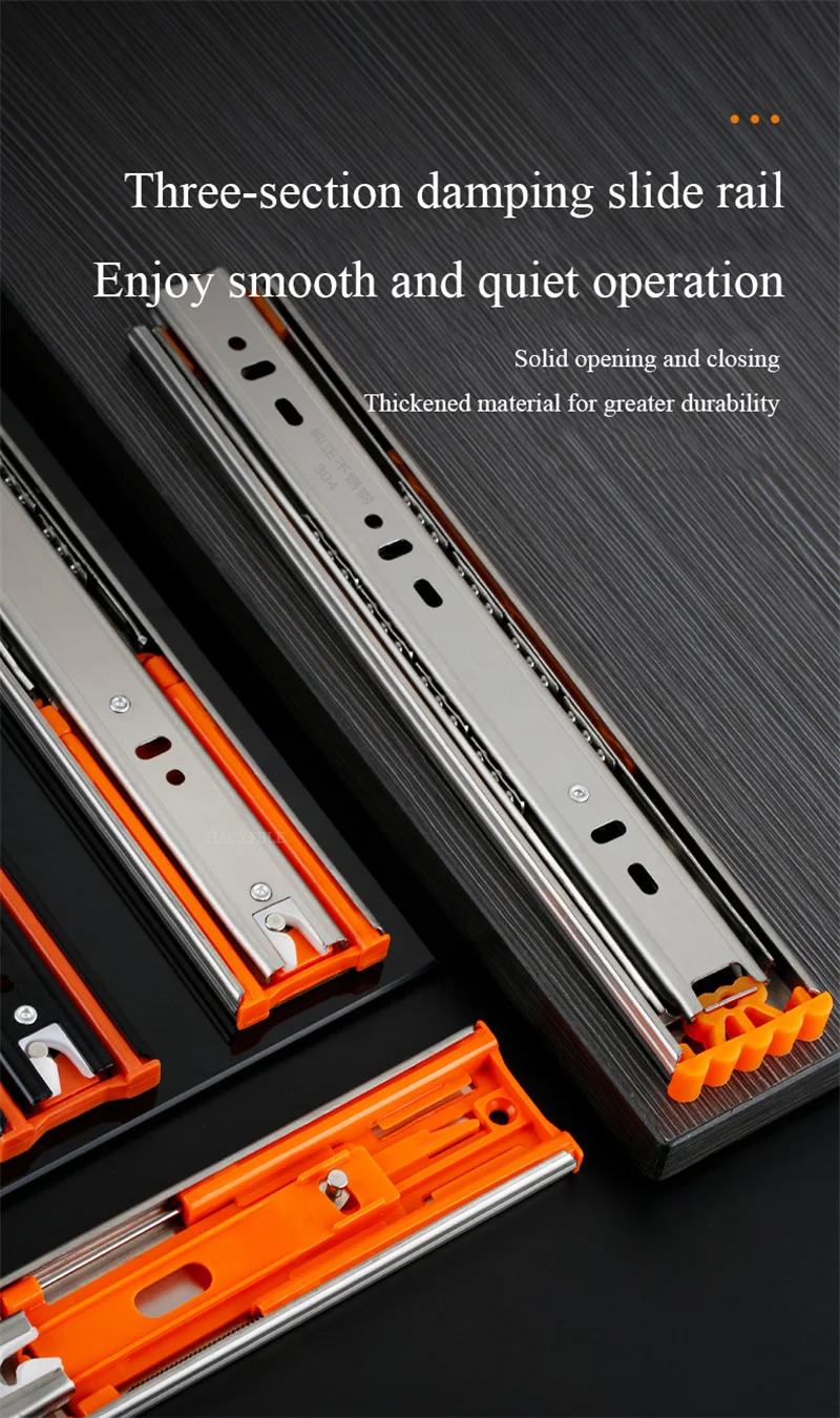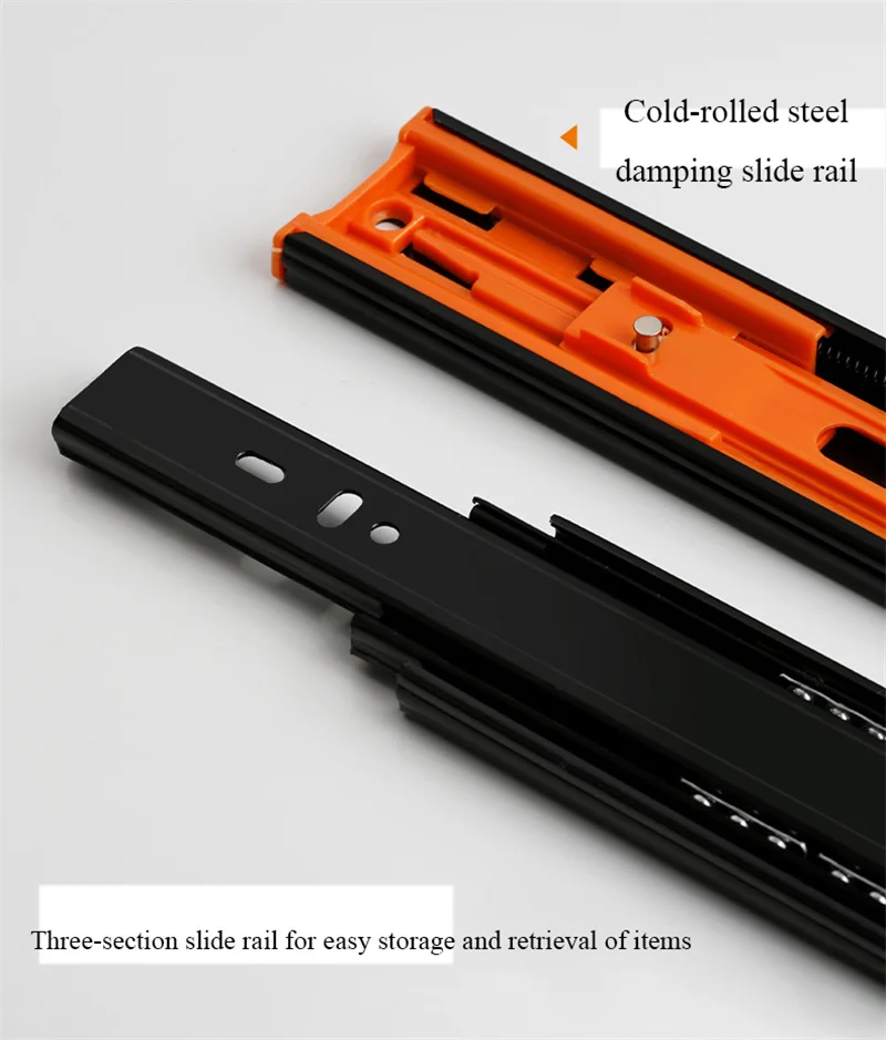 • Conception du tampon d’amortissement : La conception du tampon d’amortissement de la glissière réduit le niveau de bruit, offrant un fonctionnement silencieux et fluide pour vos armoires et tiroirs.