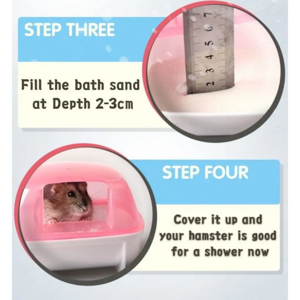 Ouvrez le couvercle supérieur, verseur du sable de bain avec une profondeur d’environ 1 cm pour lui, arrêter le couvercle et puis il placer dans l’angle de la cage.