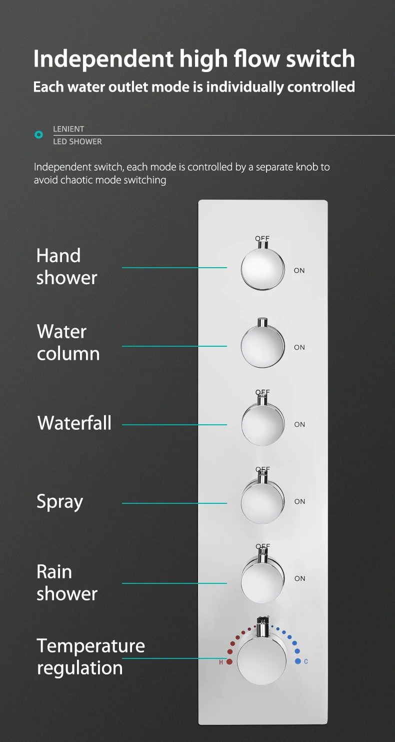 - Shower mixer: 5+1 large flow thermostatic mixer