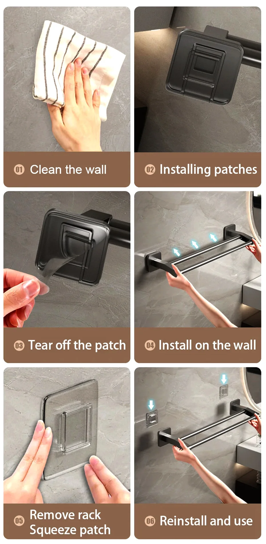 Le porte-serviettes de salle de bain témoigne du design moderne et de la fonctionnalité. Sa fonction de montage mural assure un environnement de salle de bain sans encombrement, tandis que le processus d’installation sans perçage en fait un jeu d’enfant à installer sans avoir besoin d’aide professionnelle. Le design élégant à double barre ajoute non seulement une touche d’élégance à votre décor de salle de bain, mais maximise également l’espace en vous permettant d’accrocher plusieurs serviettes à la fois. Disponible en longueurs de 30cm, 40cm, 50cm, ce porte-serviettes est suffisamment polyvalent pour s’adapter à différentes tailles et styles de salle de bain.