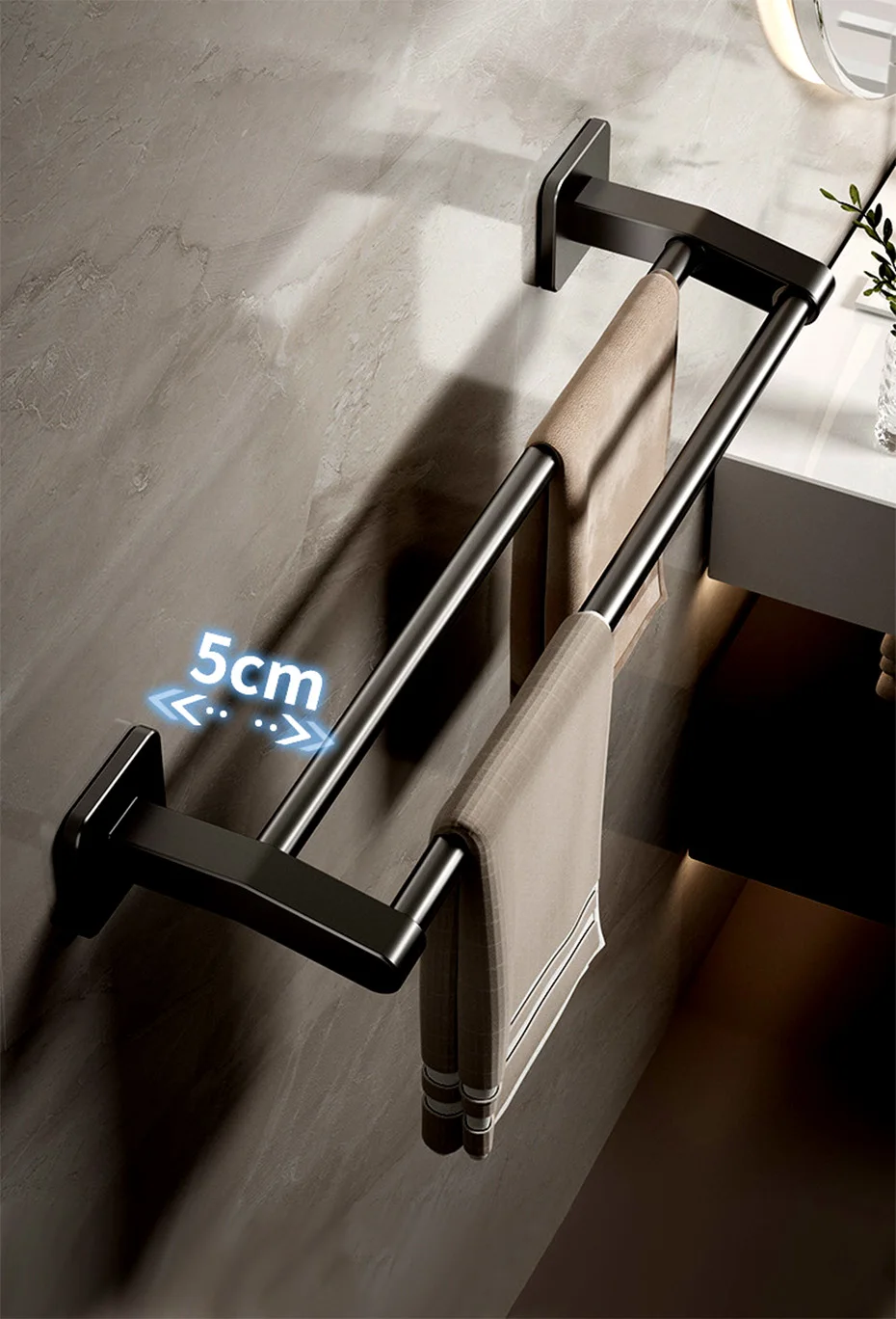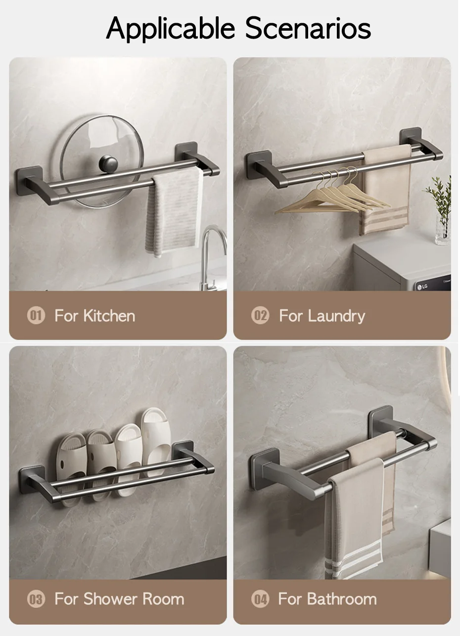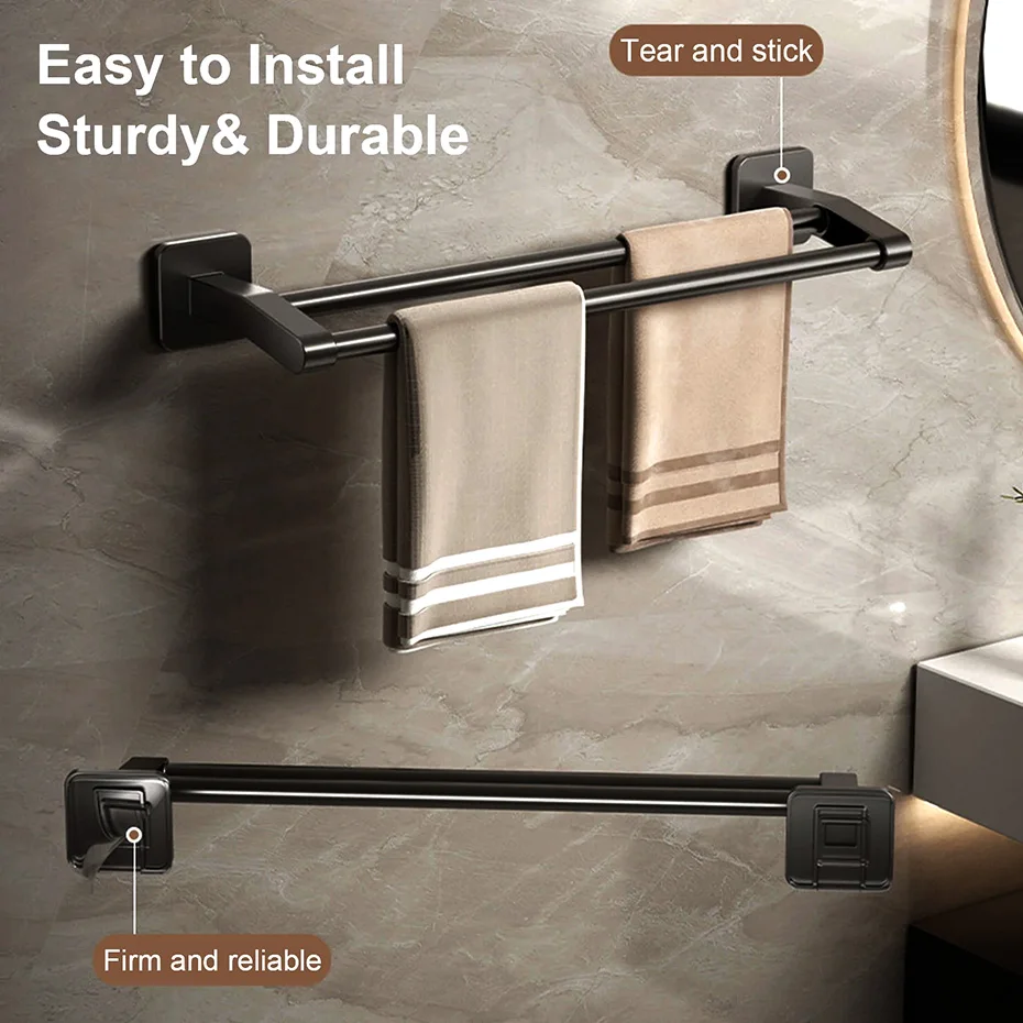 Ce porte-serviettes n’est pas seulement un élément de décoration; c’est un ajout pratique à votre salle de bain. Sa conception à double barre permet d’accrocher plusieurs serviettes, ce qui en fait un choix pratique pour les ménages occupés. La fonction de montage sans perçage du porte-serviettes signifie qu’il peut être facilement installé sur une variété de surfaces, y compris les carreaux, le bois et le verre, sans causer de dommages. Sa polyvalence s’étend à son utilisation, car il peut être utilisé pour accrocher des essuie-mains, des serviettes de bain ou même des débarbouillettes, ce qui en fait un ajout polyvalent à toute salle de bain. Avec son design moderne et ses caractéristiques pratiques, ce porte-serviettes est un excellent choix pour tous ceux qui cherchent à améliorer leurs accessoires de salle de bain.