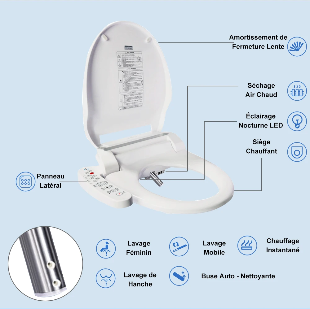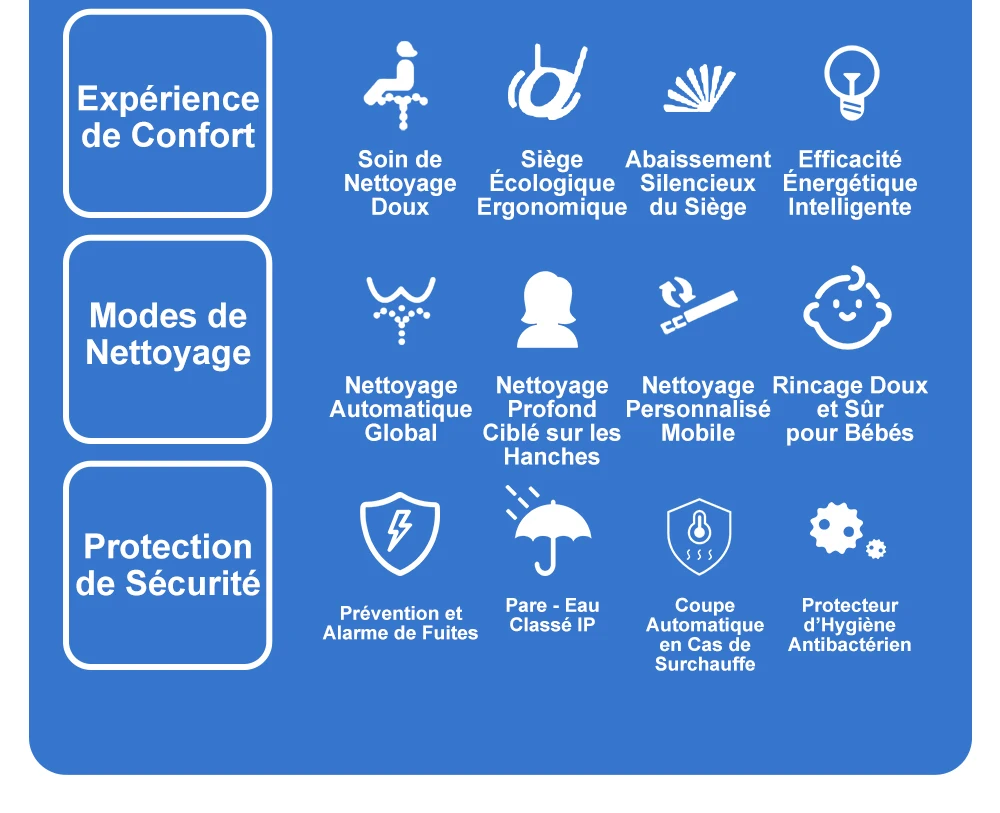 Affichage numérique de la température ● Chauffage des sièges ● Réglage de la vitesse de l’eau ● Bouton de commande latéral ● Chauffage de l’eau ● Siège antibactérien ● Économie d’énergie ● Protection contre les fuites ● Protection contre les fissures ● Séchage à l’air chaud ● Chauffage instantané ● Capteur de siège ● Nettoyage des fesses ● Nettoyage féminin ● Buse oscillante ● Buse autonettoyante ● Housse étanche IPX4 ● Veilleuse ● Arrêt doux ● Réglage de la température de l’eau ● Télécommande