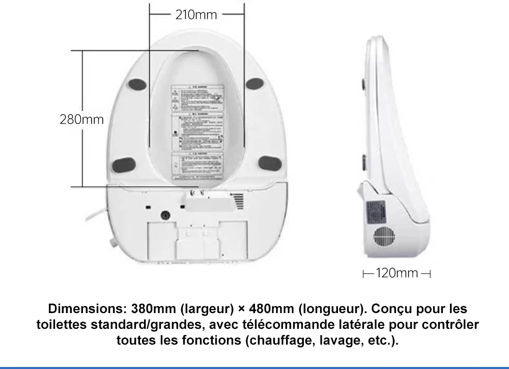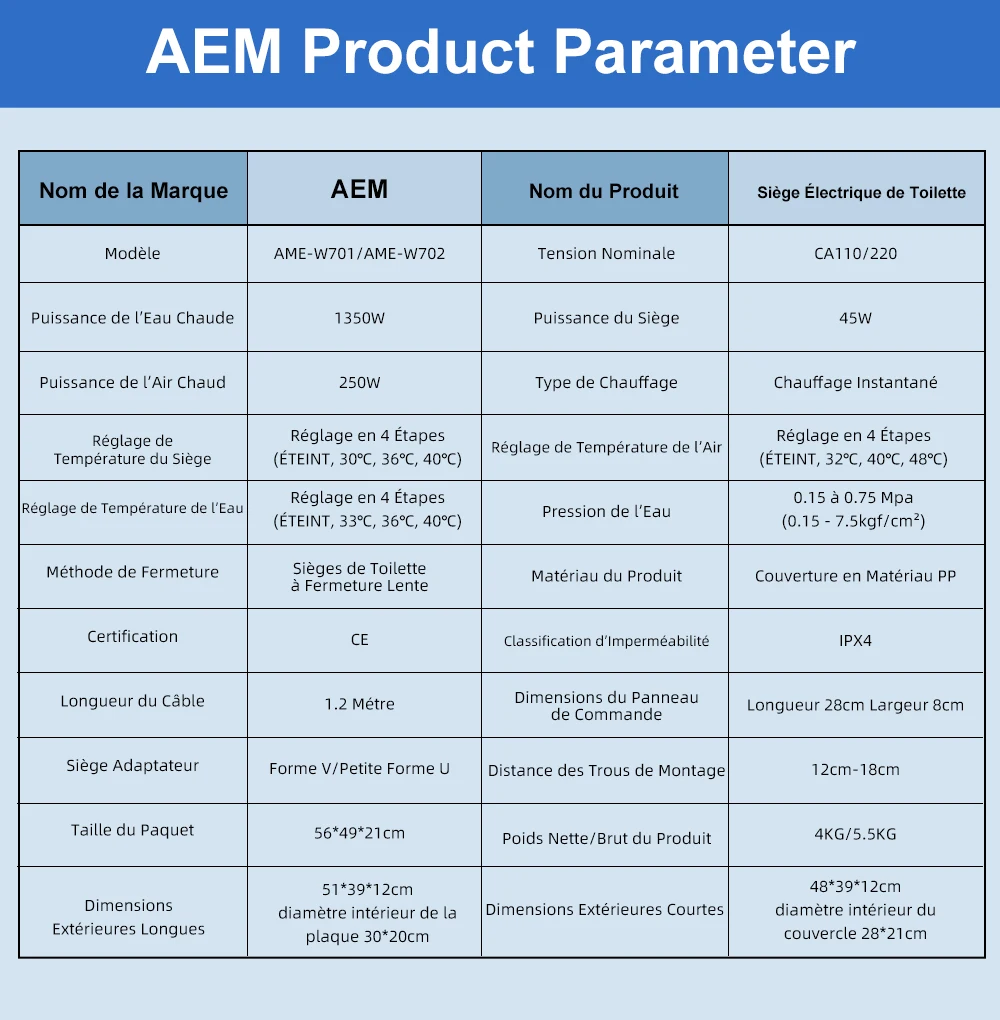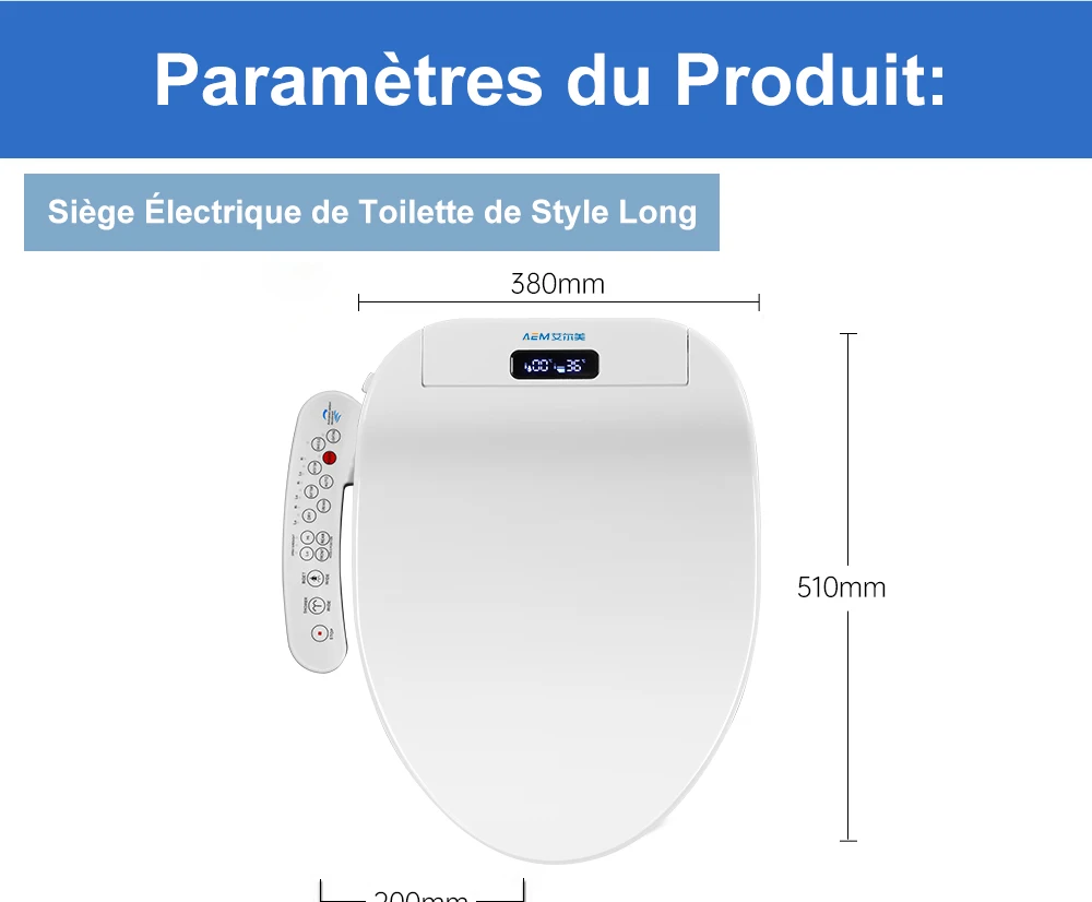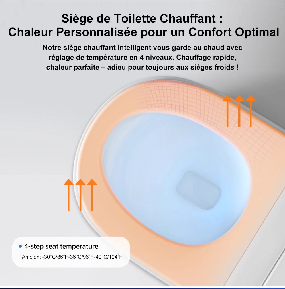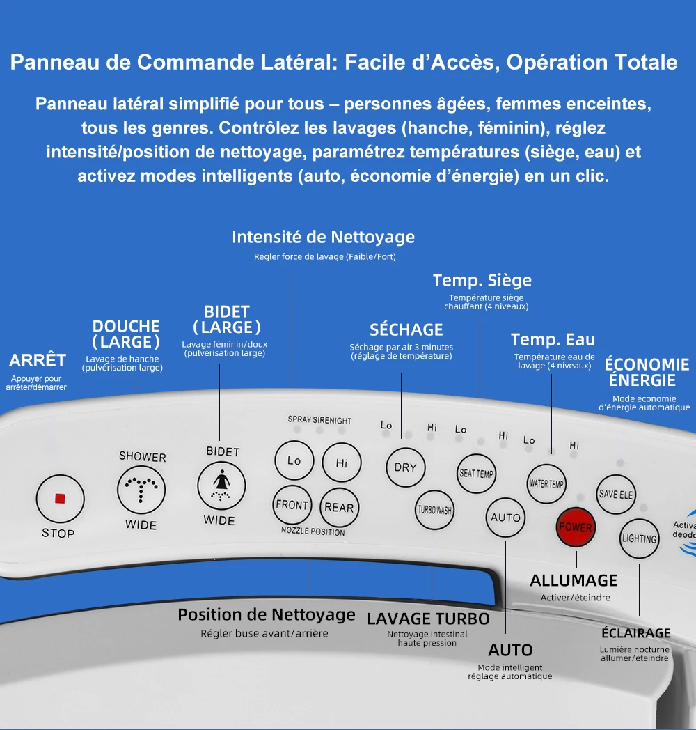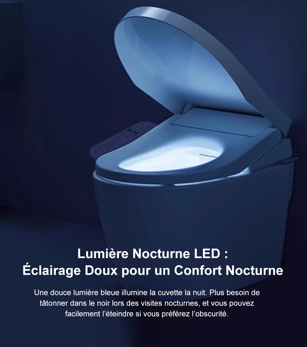 Affichage numérique de la température ● Chauffage des sièges ● Réglage de la vitesse de l'eau ● Bouton de commande latéral ● Chauffage de l'eau ● Siège antibactérien ● Économie d'énergie ● Protection contre les fuites ● Protection contre les fissures ● Séchage à l'air chaud ● Chauffage instantané ● Capteur de siège ● Nettoyage des fesses ● Nettoyage féminin ● Buse oscillante ● Buse autonettoyante ● Housse étanche IPX4 ● Veilleuse ● Arrêt doux ● Réglage de la température de l'eau ● Télécommande