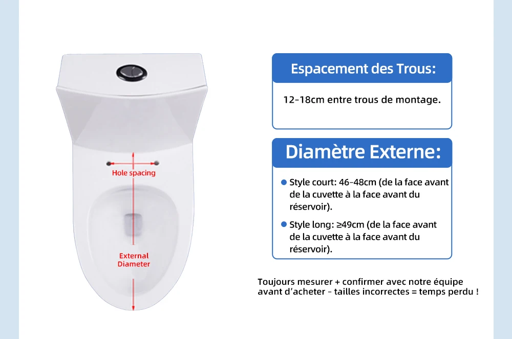 2. Pour s’adapter à la taille des toilettes, la distance entre les deux trous d’installation des toilettes est de 12 cm à 18 cm.Si la distance entre l’avant des toilettes et le réservoir d’eau est inférieure à 500 mm, vous pouvez choisir 480 mm (courte).Si la taille est supérieure à 500 mm, vous pouvez choisir 510 mm (longueur), n’hésitez pas à acheter.