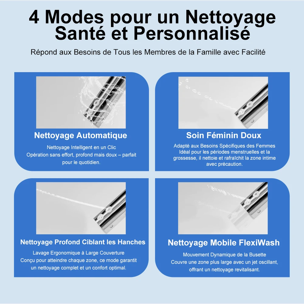 Quatre modes de nettoyage :nettoyage doux, nettoyage des hanches, nettoyage mobile, nettoyage automatique.