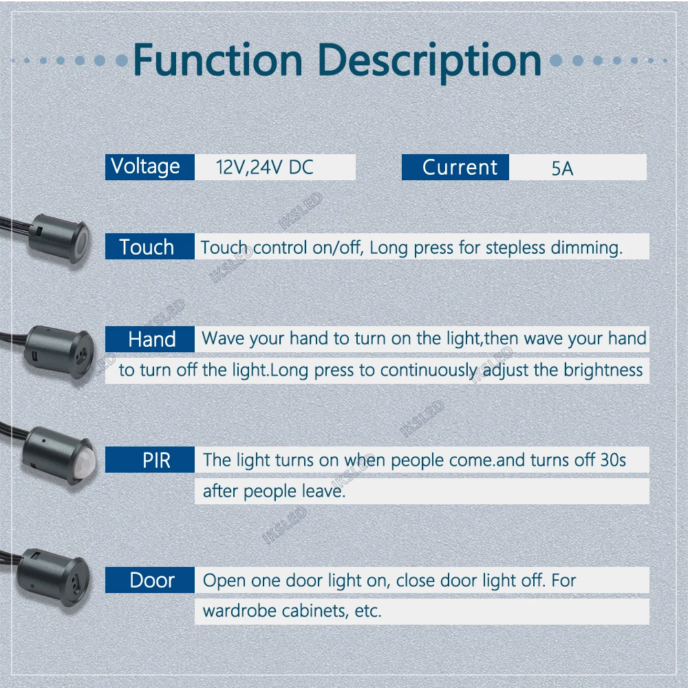 - Single-Door Control Sensor Switch: Open one door light on, close door light off For wardrobe cabinets, etc.