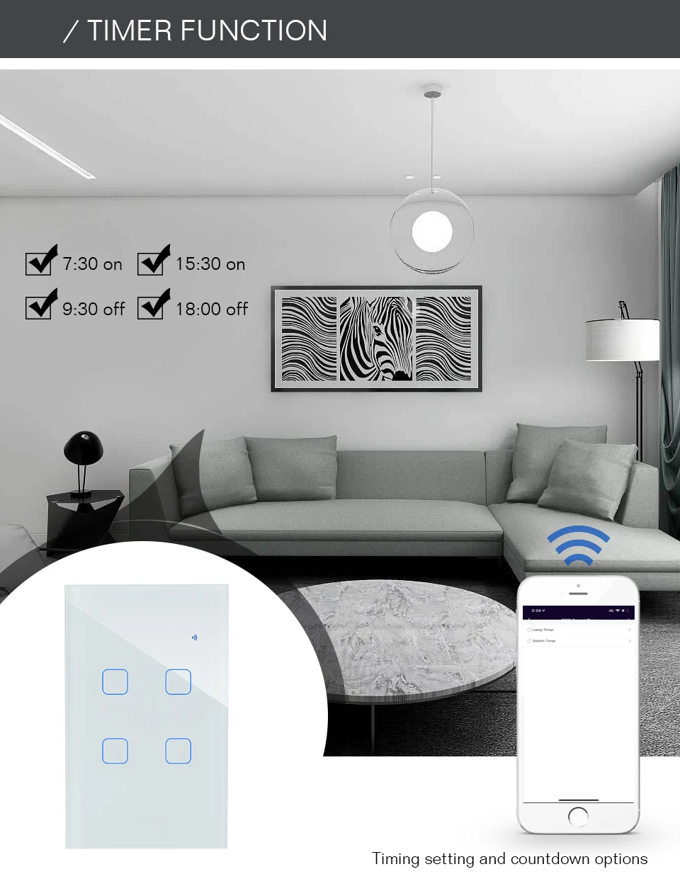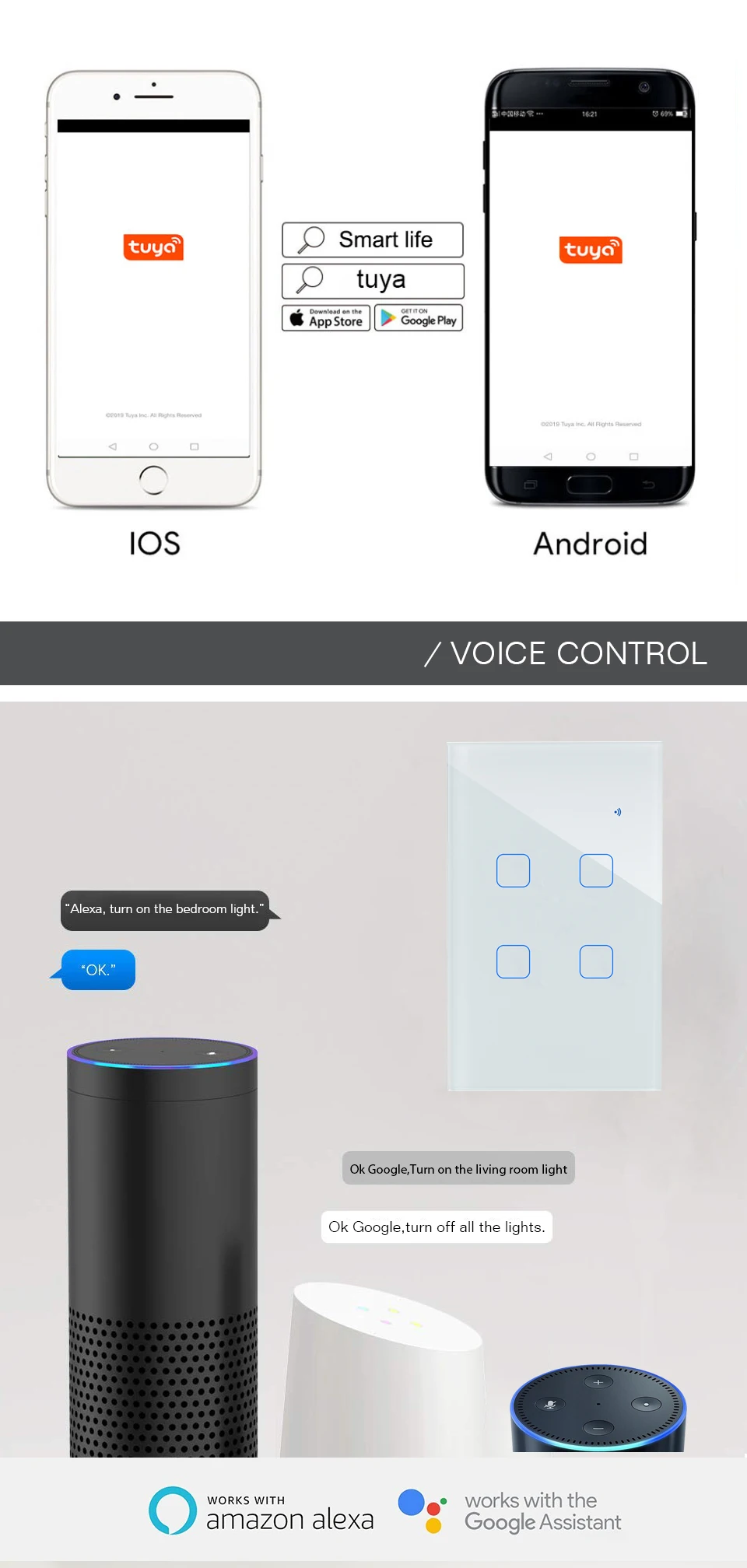 Interrupteur d’éclairage intelligent Wifi, écran tactile en verre, commande vocale, interrupteur mural sans fil, fonctionne avec Alexa Google Home, 1/2/3/4 gangs