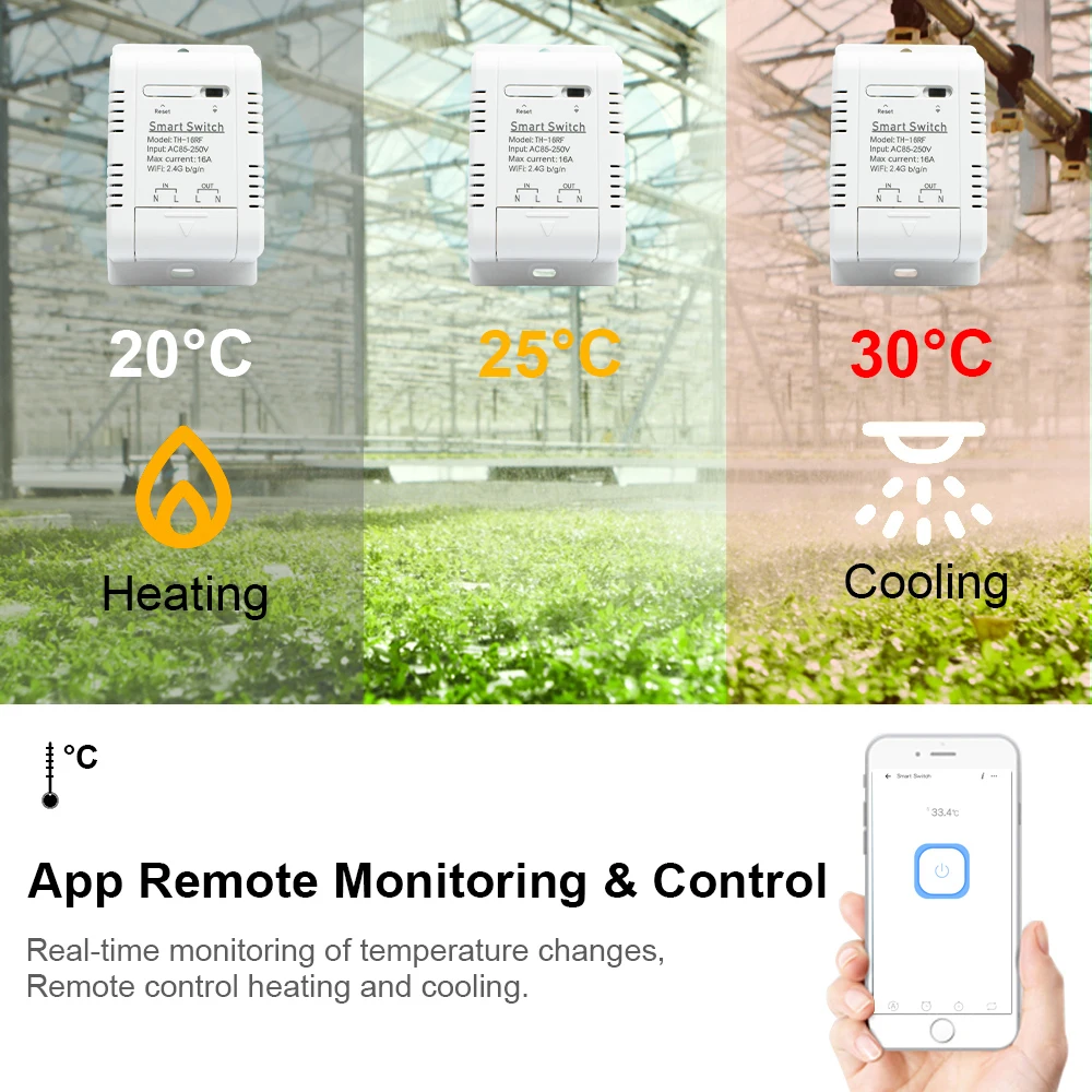 * ON/OFF à distance : transformez les appareils électriques marche/arrêt depuis n’importe où, avec capteur étanche de température de haute précision.