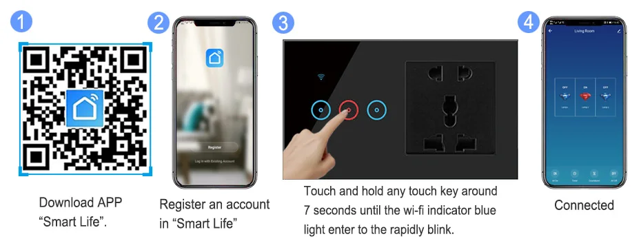 Téléchargez Smart Life depuis l’App Store ou Google Play et connectez votre appareil mobile à votre réseau Wi-Fi 2.4GHz pour trouver votre interrupteur d’éclairage, alors vous pouvez contrôler les lumières ou d’autres appareils électriques avec facilité.