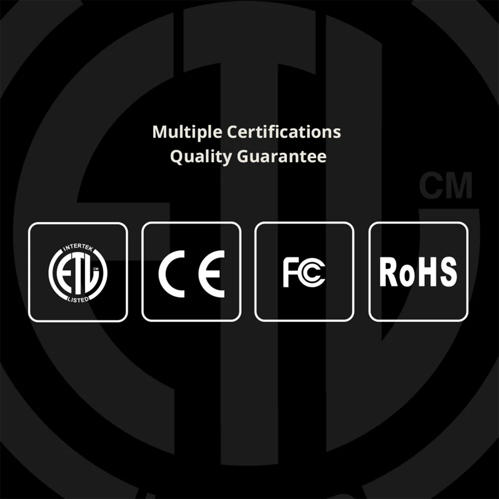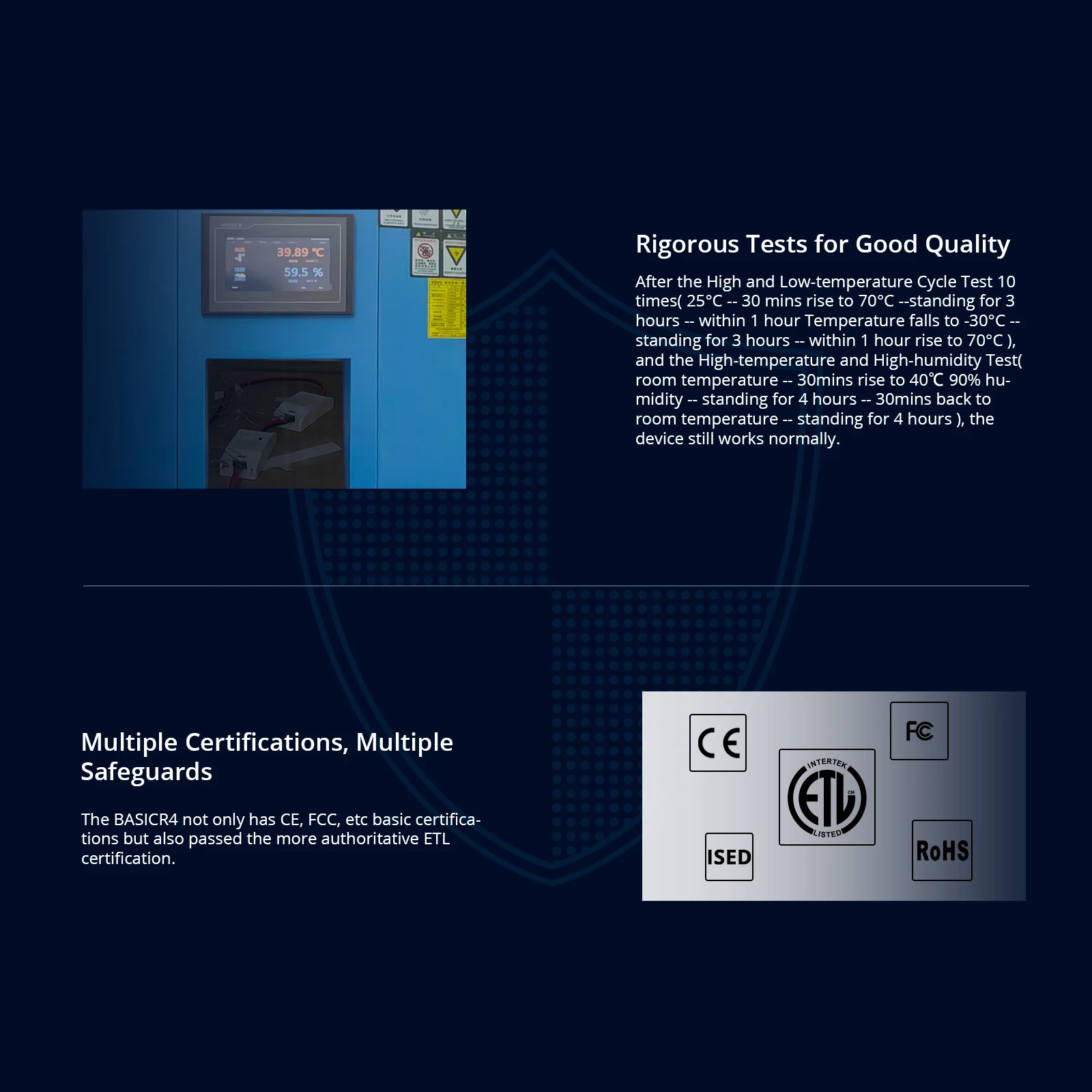 Avec le capteur de température intégré du produit, la température maximale en temps réel de l’ensemble du produit peut être détecté et spéculé, qui empêche le produit de la déformation, de la fusion, du feu ou dans l’exposition en cas de surtempérature.Le BASICR4 n’a pas seulement des certifications de base CE, FCC, etc., mais réussi également la certification ETL plus authoritative.