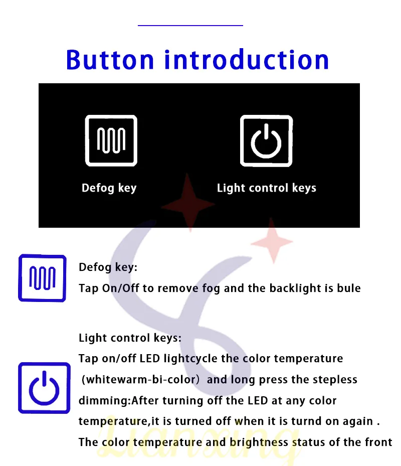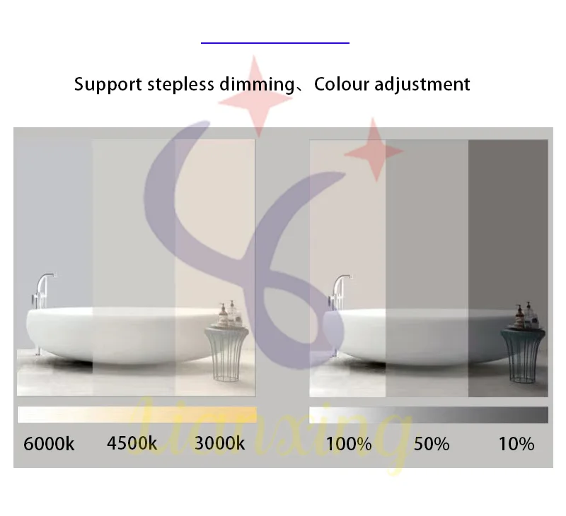 - Product Features: Defogging+ stepless dimming+Adjust color