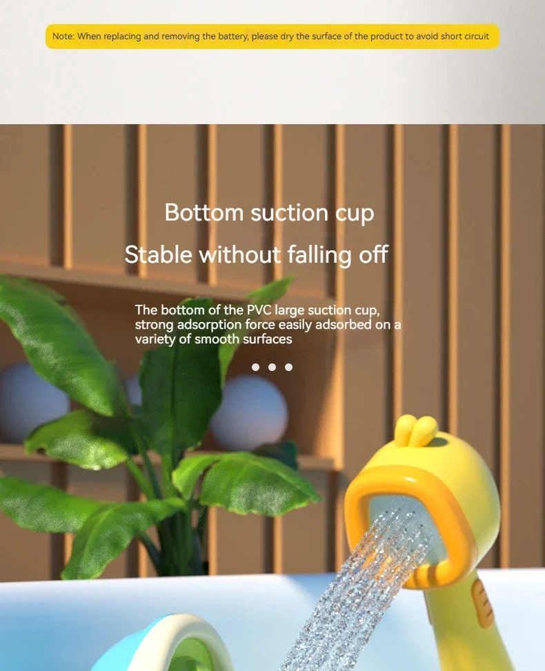 Le moteur activé par l’eau ne nécessite aucune pile (étanche IPX8. Un débit d’eau doux de 0,5 W n’effrayera pas les bébés, répond aux normes de sécurité EN71 et ASTM F963 avec des becs en silicone sans BPA.