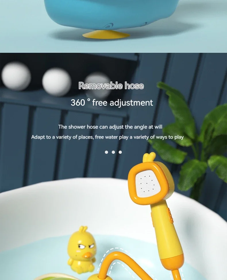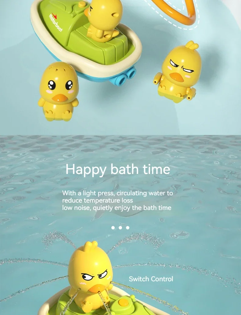 3 canards flottants avec visages émotion interchangeables (heureux/sommeil/surpris) développer la cognition émotionnelle. L’hélice rotative actie 360° pulvérisation d’eau, testée pour réduire l’heure du bain de 30 % sur les essai des tout-petits.