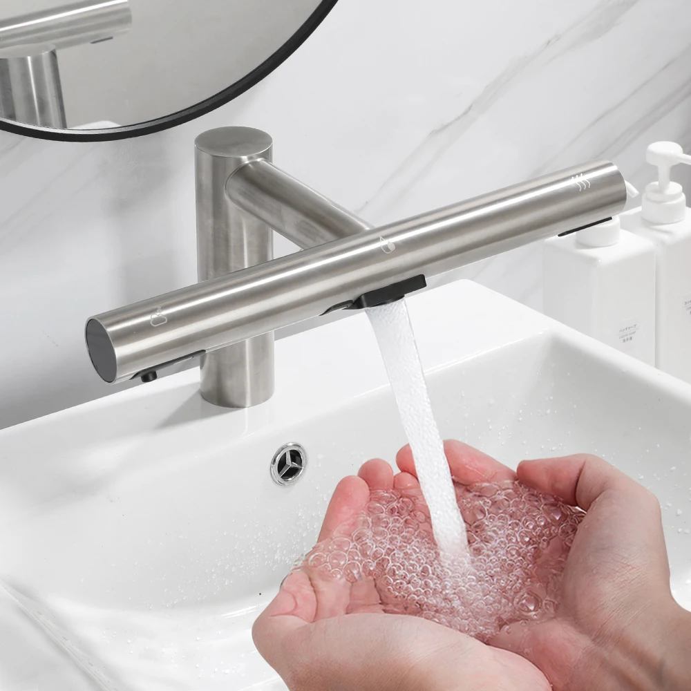 Conception innovante tout-en-un : ce produit combine un robinet à capteur automatique, un distributeur de savon et un sèche-mains en une unité. Cette intégration innovante sauvez un espace précieux dans la salle de bain et offre une solution pratique et multifonctionnelle pour les utilisateurs. Cela rationaliser le processus de lavage des mains, vous permettant de laver, de la mousse et sécher vos mains en une emplacement compact.