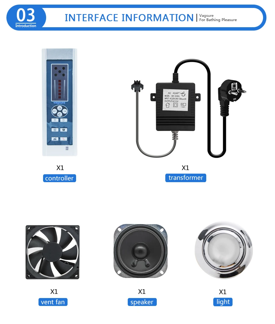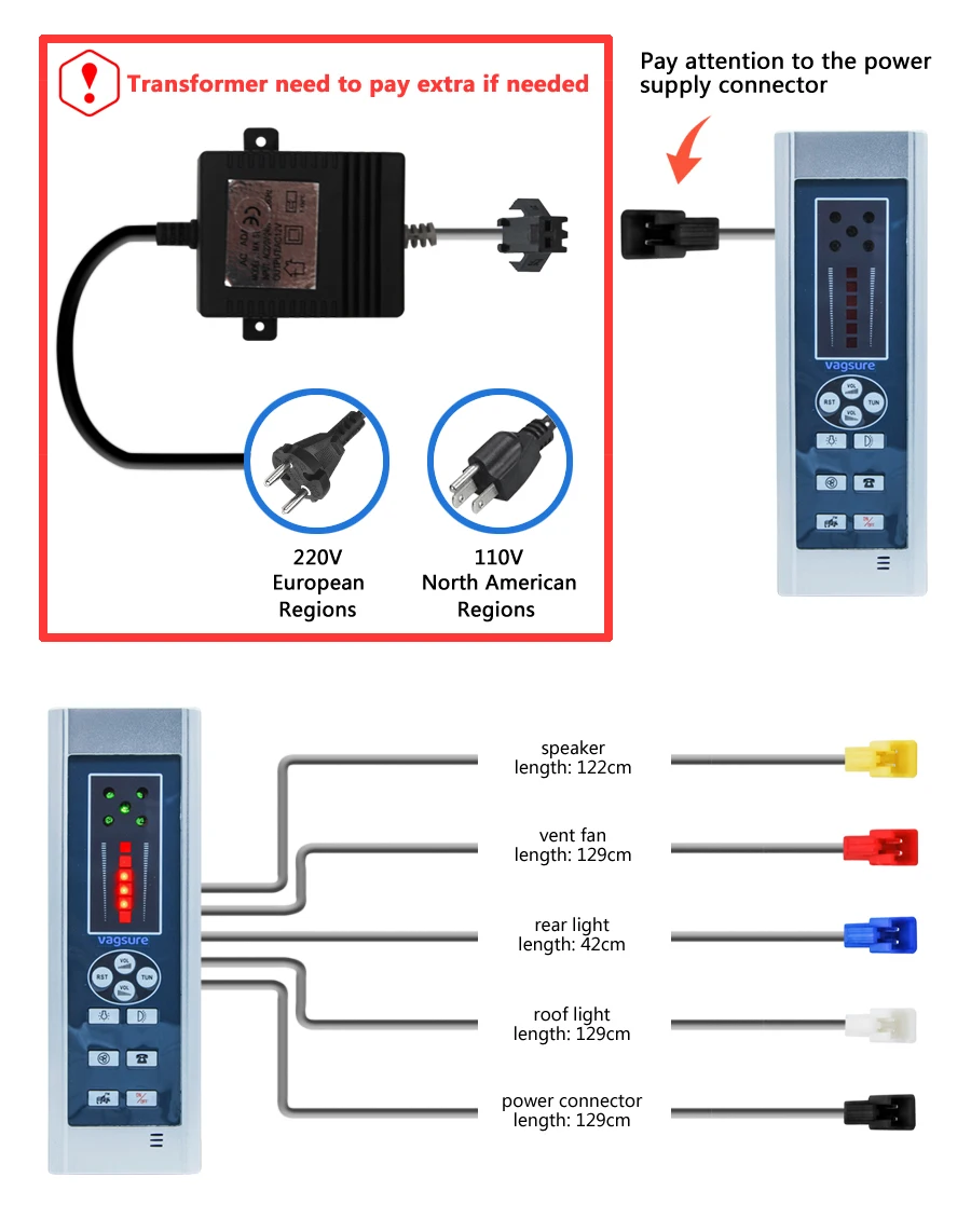 • Accessories: Panel/speaker/vent fan/light/transformer