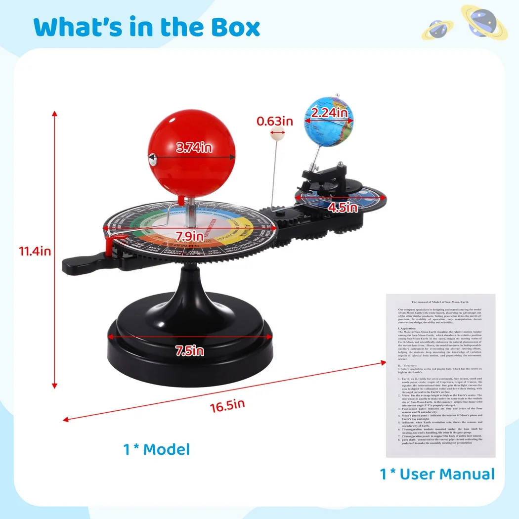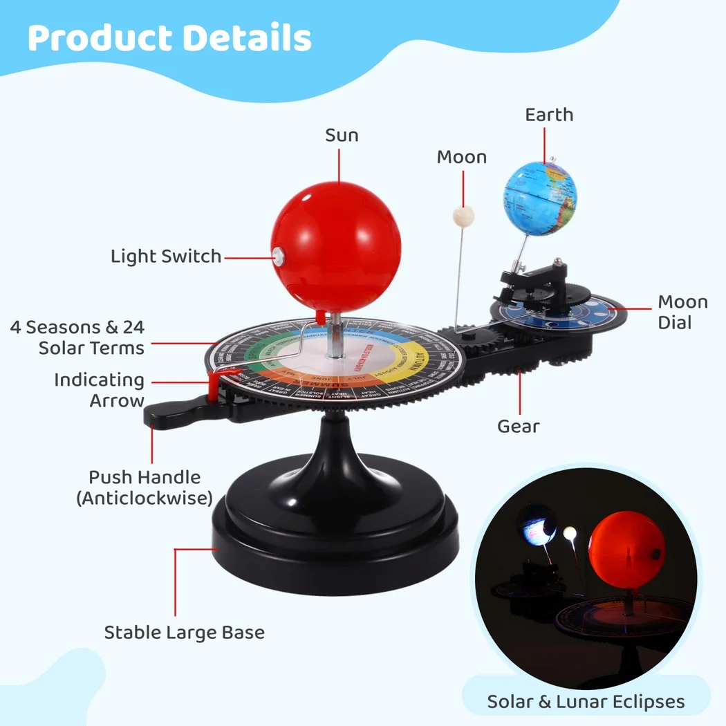 【Apprentissage visuel activé】 Soyez témoin de la beauté de notre planète détaillée avec les continents et les océans, complétée par une ampoule centrée par le soleil qui éclaire à la fois la Terre et la Lune.Cette aide visuelle démontre considérablement les éclipses et les changements saisonniers, rendant les complexités de notre système solaire faciles à comprendre.