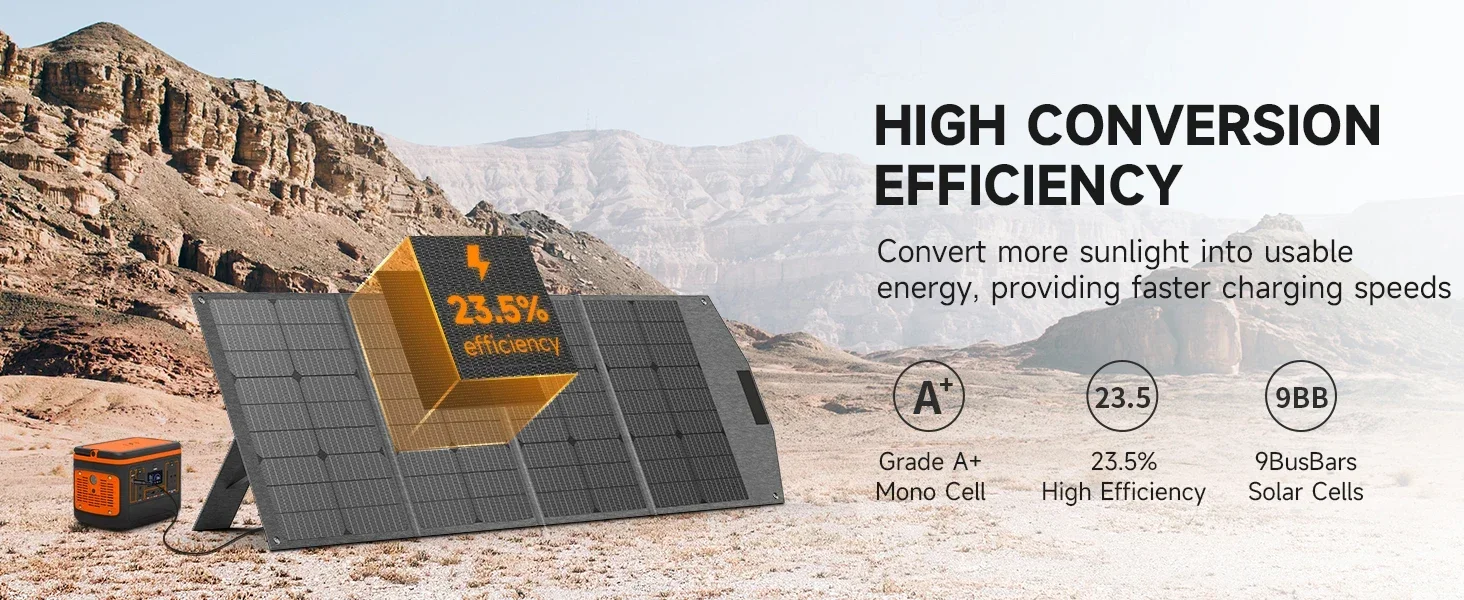 【Haute efficacité de conversion, charge rapide】Les cellules solaires monocristallines 9BB A + améliorées atteignent un taux de conversion de 23.5%, permettant une capture maximale de l’énergie solaire. Sous un ensoleillement abondant, ils peuvent générer une puissance de sortie maximale. Le dernier boîtier laminé ETFE fournit un taux de transmission de la lumière de plus de 95%, ce qui améliore considérablement les performances des cellules solaires.