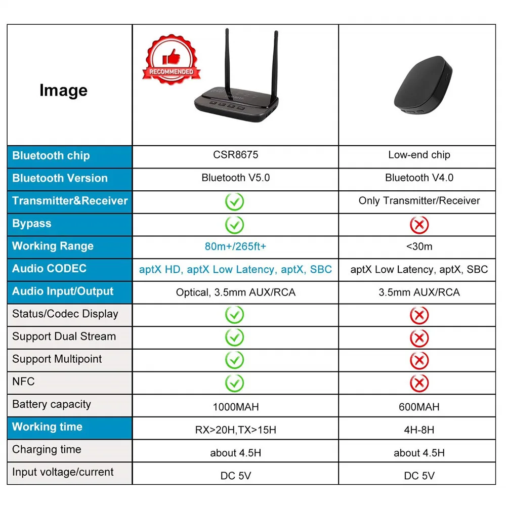 【BLUETOOTH 5.0 HI-FI Aptx HD/LL】Comprend la version la plus élevée Bluetooth V5.0 et la puce CSR8675 haut de gamme pour offrir la meilleure efficacité de transmission, stabilité et consommation d’énergie ultra-faible.Prend en charge AptX HD et AptX à faible latence, offrant de manière transparente des flux sonores stéréo de qualité CD haute fidélité.C’est le meilleur choix si vous recherchez un récepteur et un émetteur audio Bluetooth rentables.