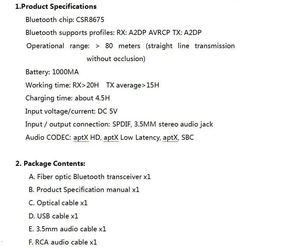 【BLUETOOTH 5.0 HI-FI Aptx HD/LL】 présentez la version plus élevée Bluetooth V5.0 et la puce CSR8675 haut de gamme pour fournir une meilleure efficacité de transmission, une stabilité et un très faible consommation d’énergie.Prise en charge des flux sonores stéréo de qualité CD haute fidélité AptX HD et AptX à faible latence et à perfectionner correctement.C’est le meilleur choix si vous recherchez un récepteur et transmetteur audio Bluetooth rentables.