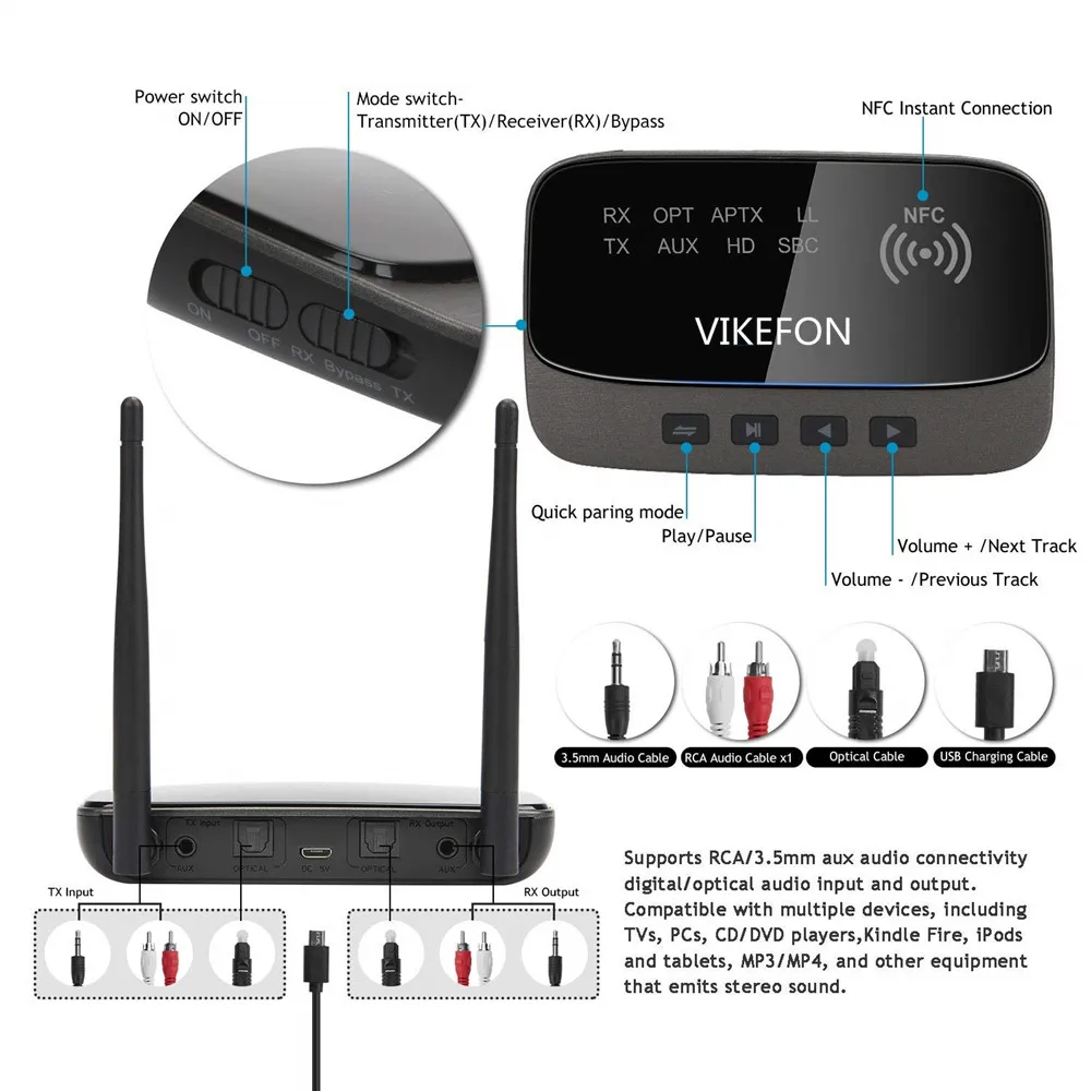 【15-20 heures LONG STANDBY TIME & NFC】 Batterie puissante intégrée de 1000 MAH, il propose 15 heures sur le mode TX et 20 heures sur un mode RX d’utilisation solide sur une charge, vous peut également l’utiliser tout le chargement.Prise en charge de la connectivité audio aux RCA/3,5 mm, entrée et sortie audio numérique/optique, c’est compatible avec presque tous les appareils.Il peut être un lien rapide par NFC.
