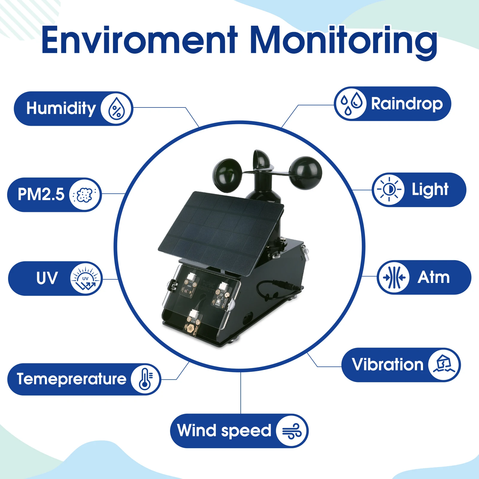 1.Surveillance météo : capteurs de compréhension pour la température, l’humidité, la vitesse du vent, les UV et la qualité de l’air.