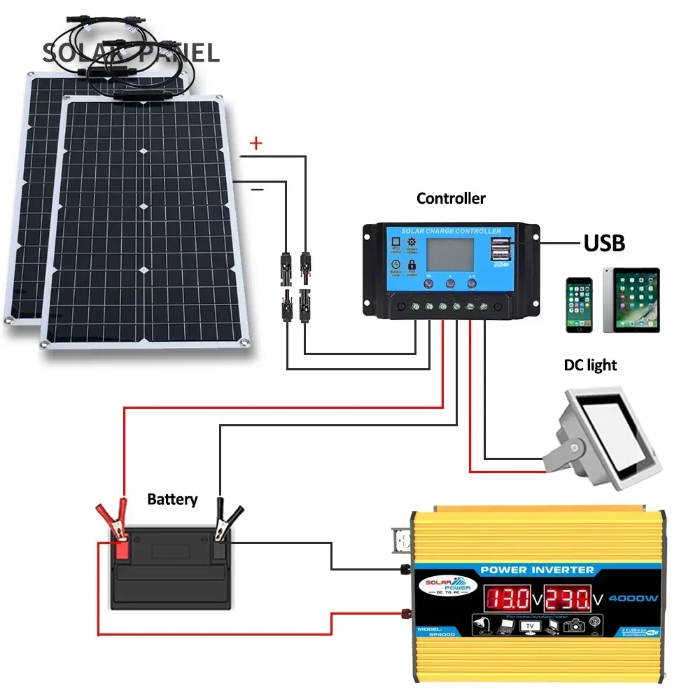 panneau solaire (pour recevoir de l’énergie solaire pour charger la batterie)+Inverseur (pour convertir l’alimentation 12 V CC de la batterie en alimentation 220 V ou 110 V AC)+contrôleur solaire (pour contrôler la charge et la décharge de la batterie) (stockage énergétique) (fabriqué par le client)